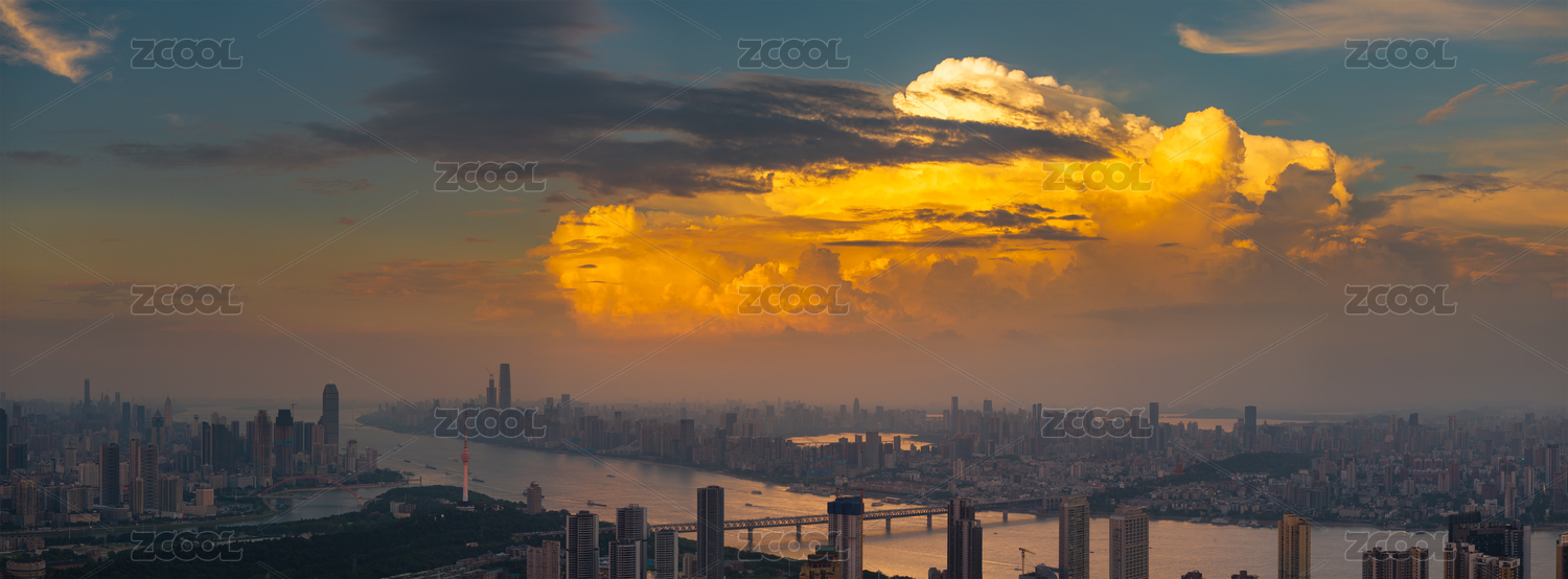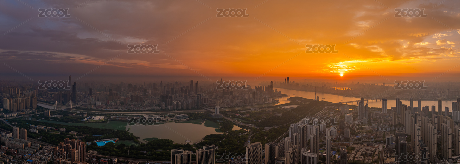 广州珠江岸城市建筑群与日出云彩航拍长图