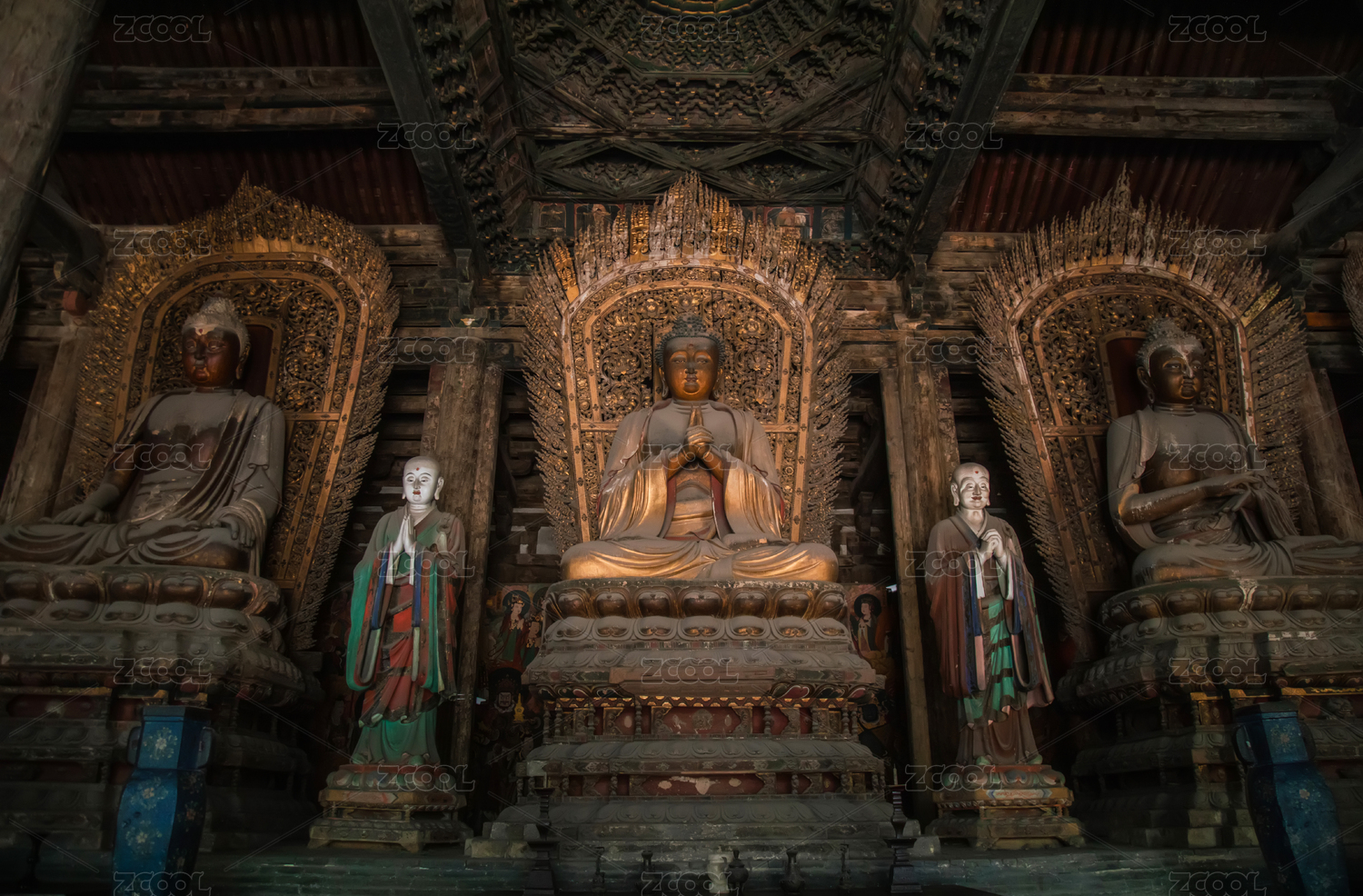 山西大同善化寺,大雄宝殿内的五方佛与藻井