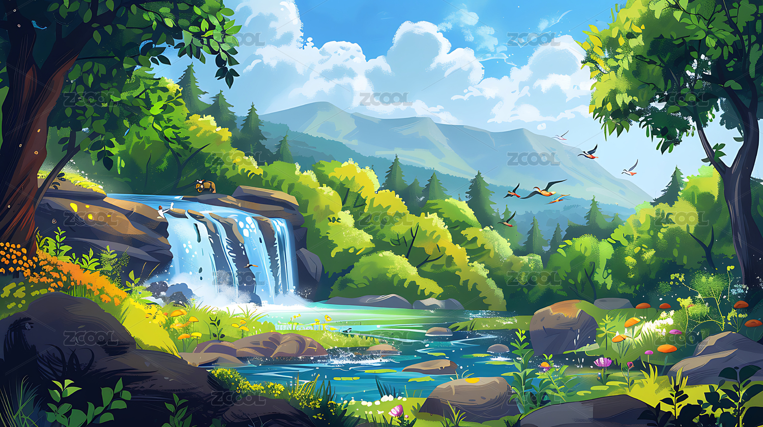 河流自然美景插画