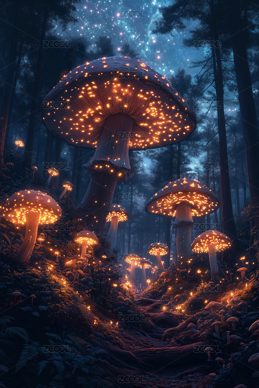 蘑菇,森林,插画,菌子,发光,光,夜晚,晚上,魔法,童话