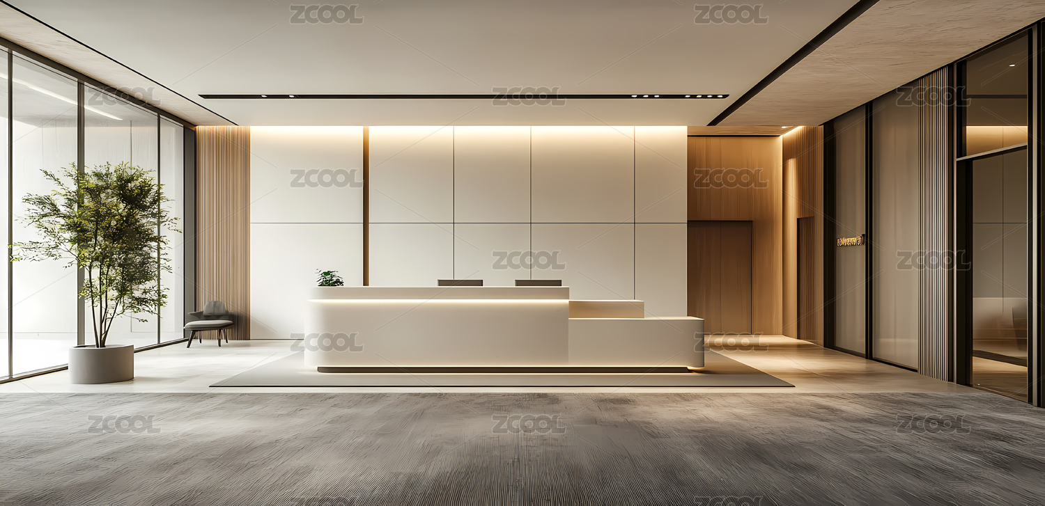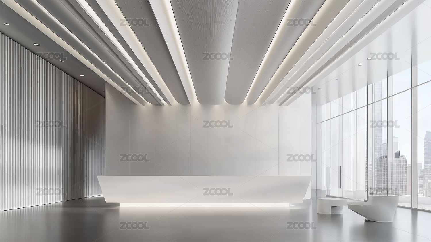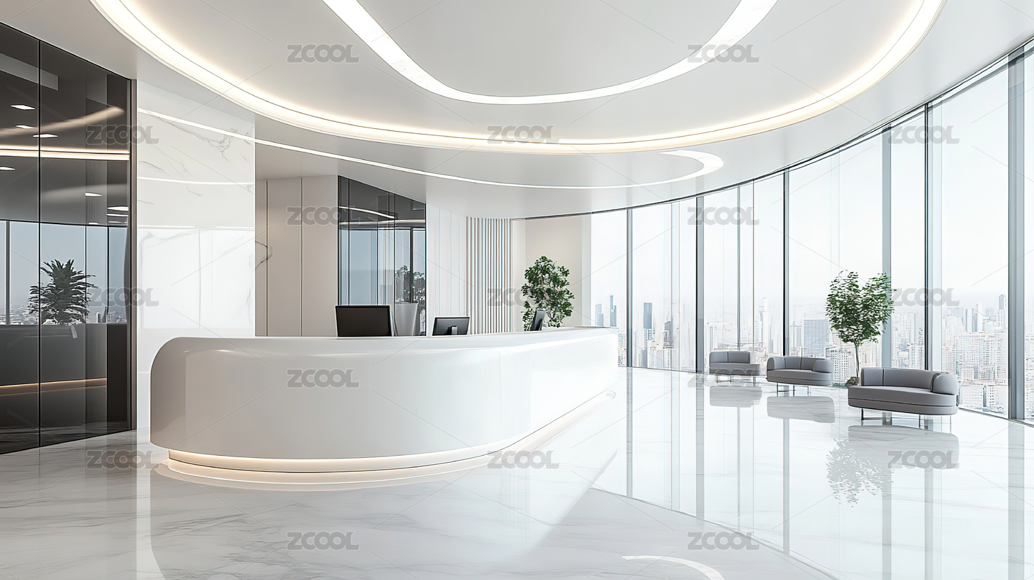 现代风格,光滑,墙面,几何,线条设计,长形,接待台,物品摆放,大窗户,城市景观