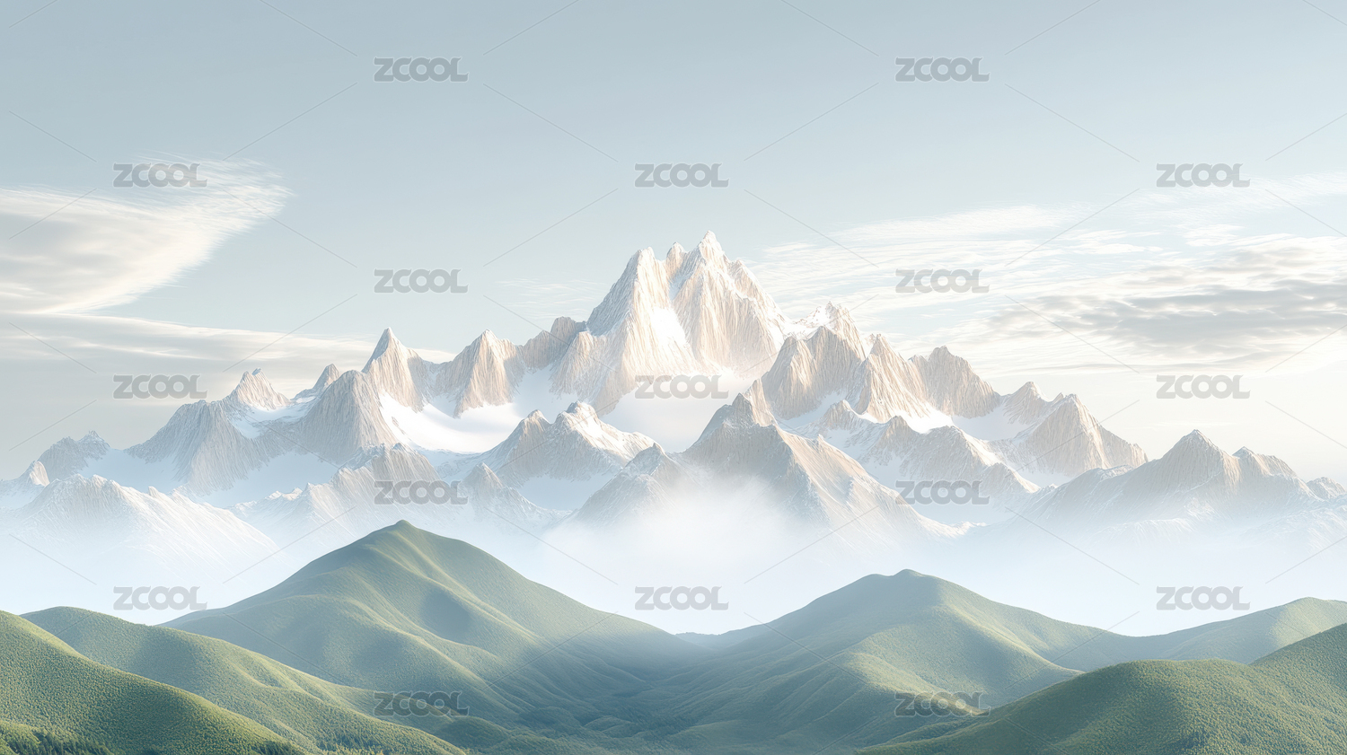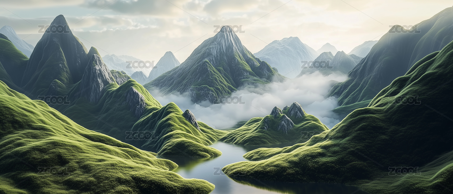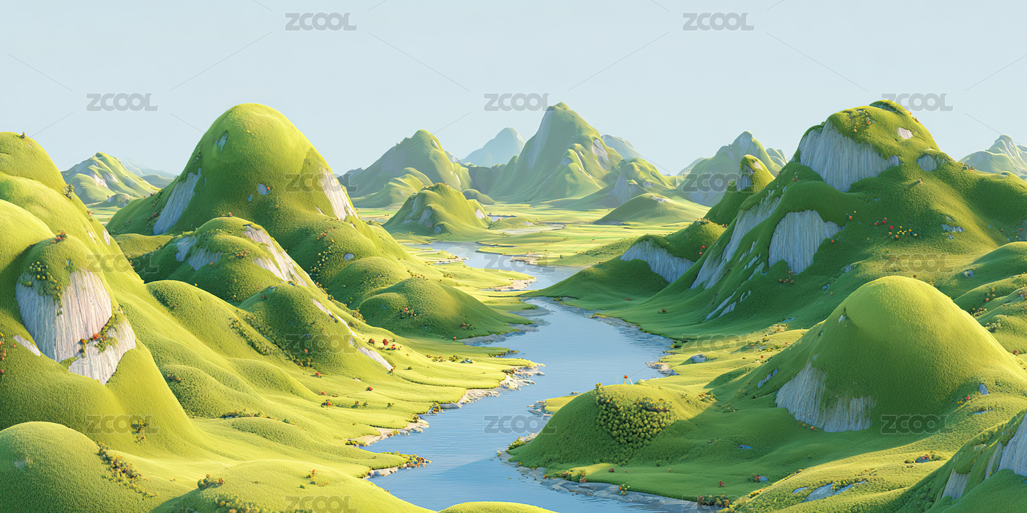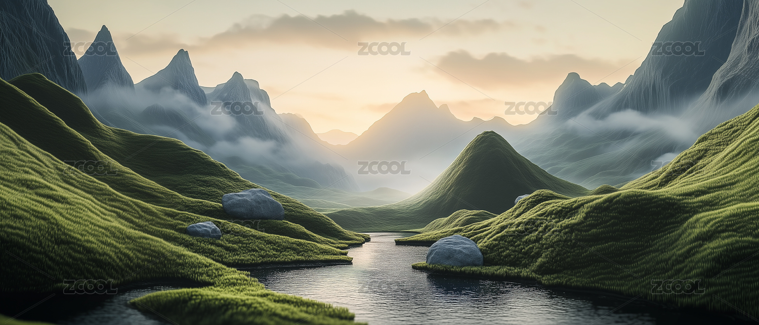 绿地,岩石,树木,雪山,蓝天,白云,清澈溪流,宁静平和,自然风光,美丽景色