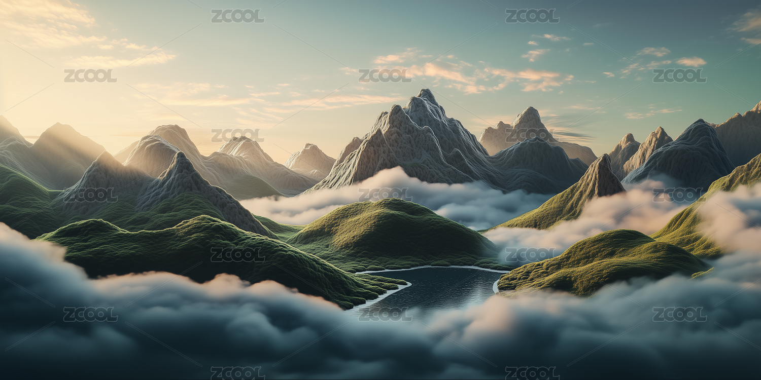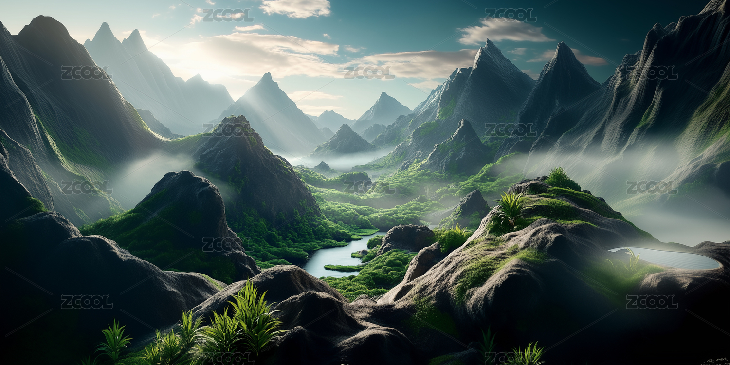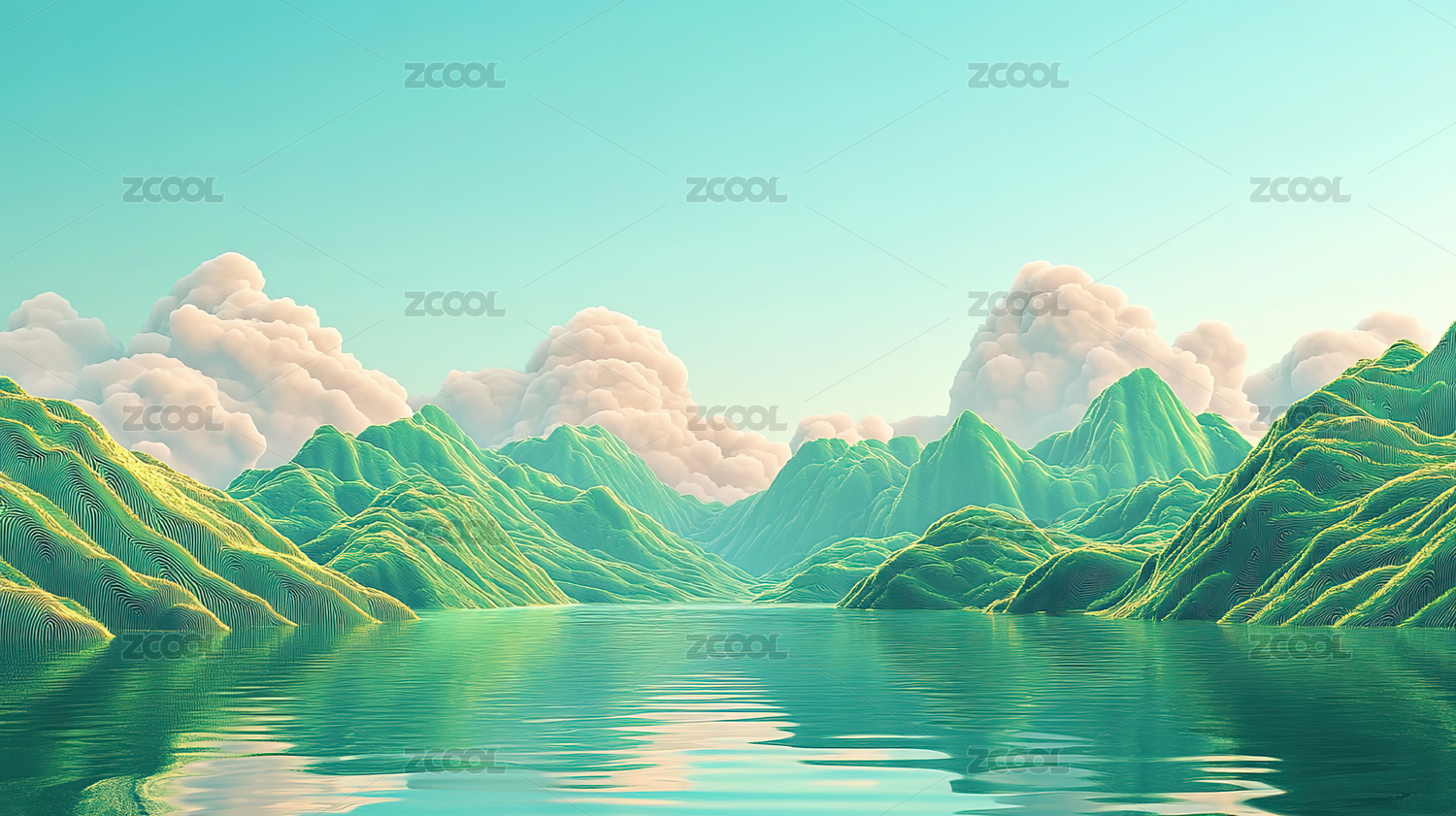 绿地,岩石,树木,雪山,蓝天,白云,清澈溪流,宁静平和,自然风光,美丽景色
