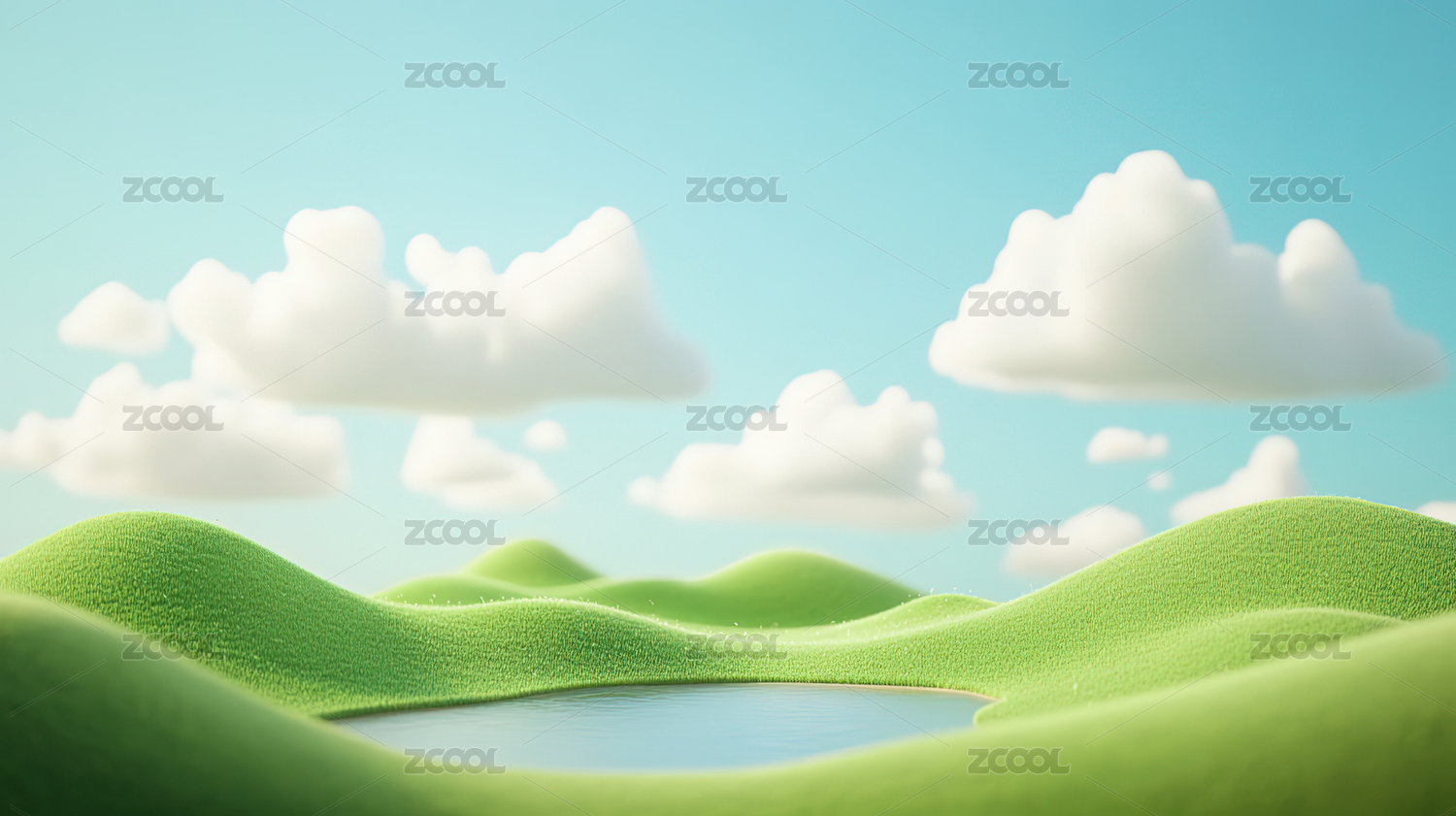 绿色的大堤中间蜿蜒的河流风景3D卡通插画