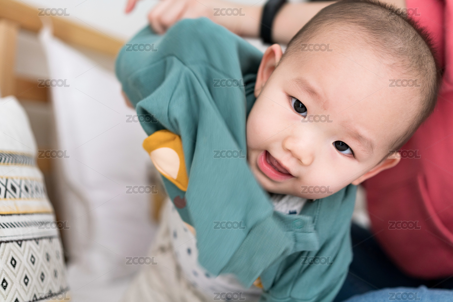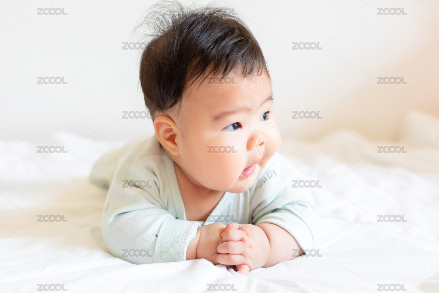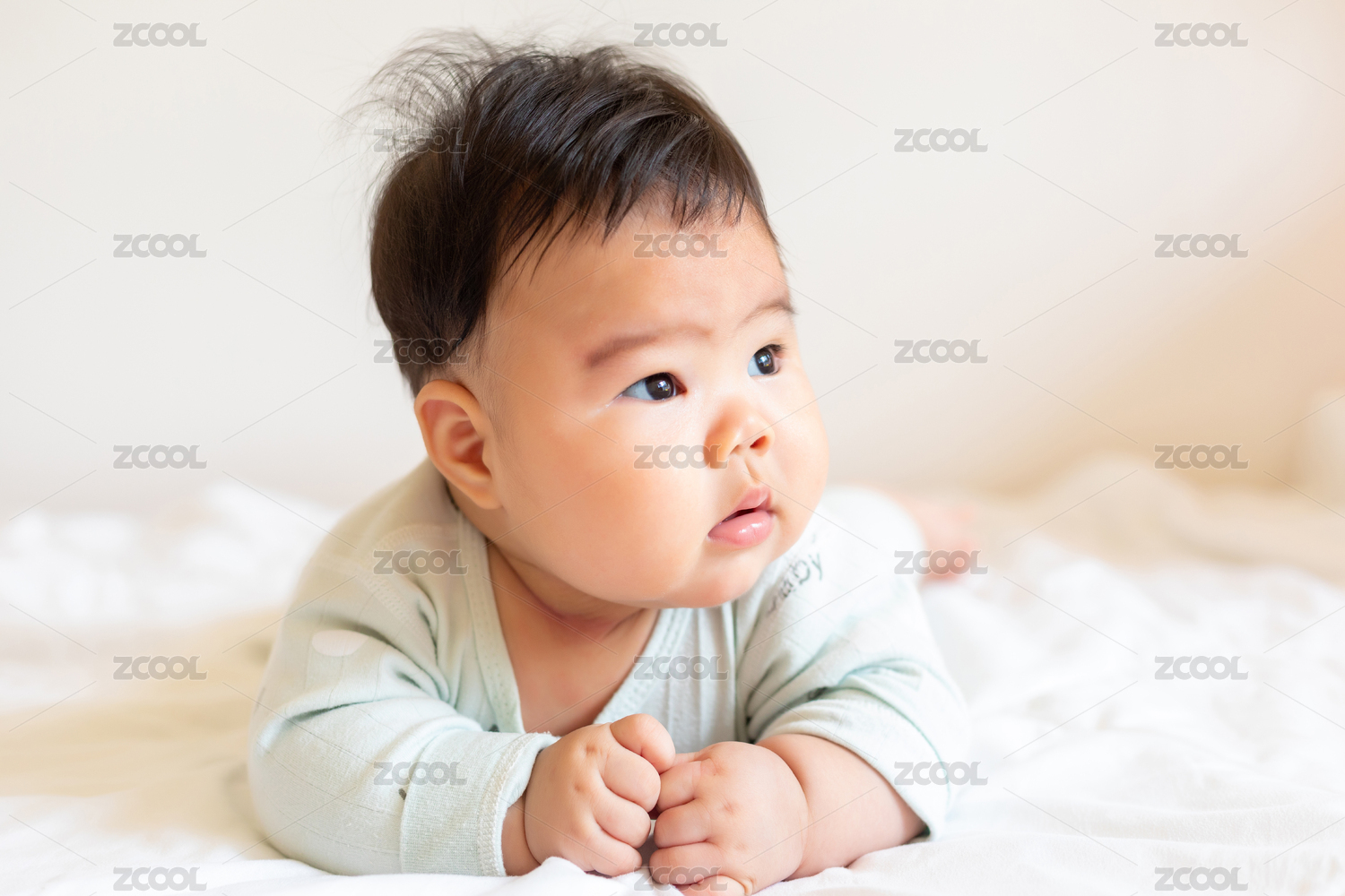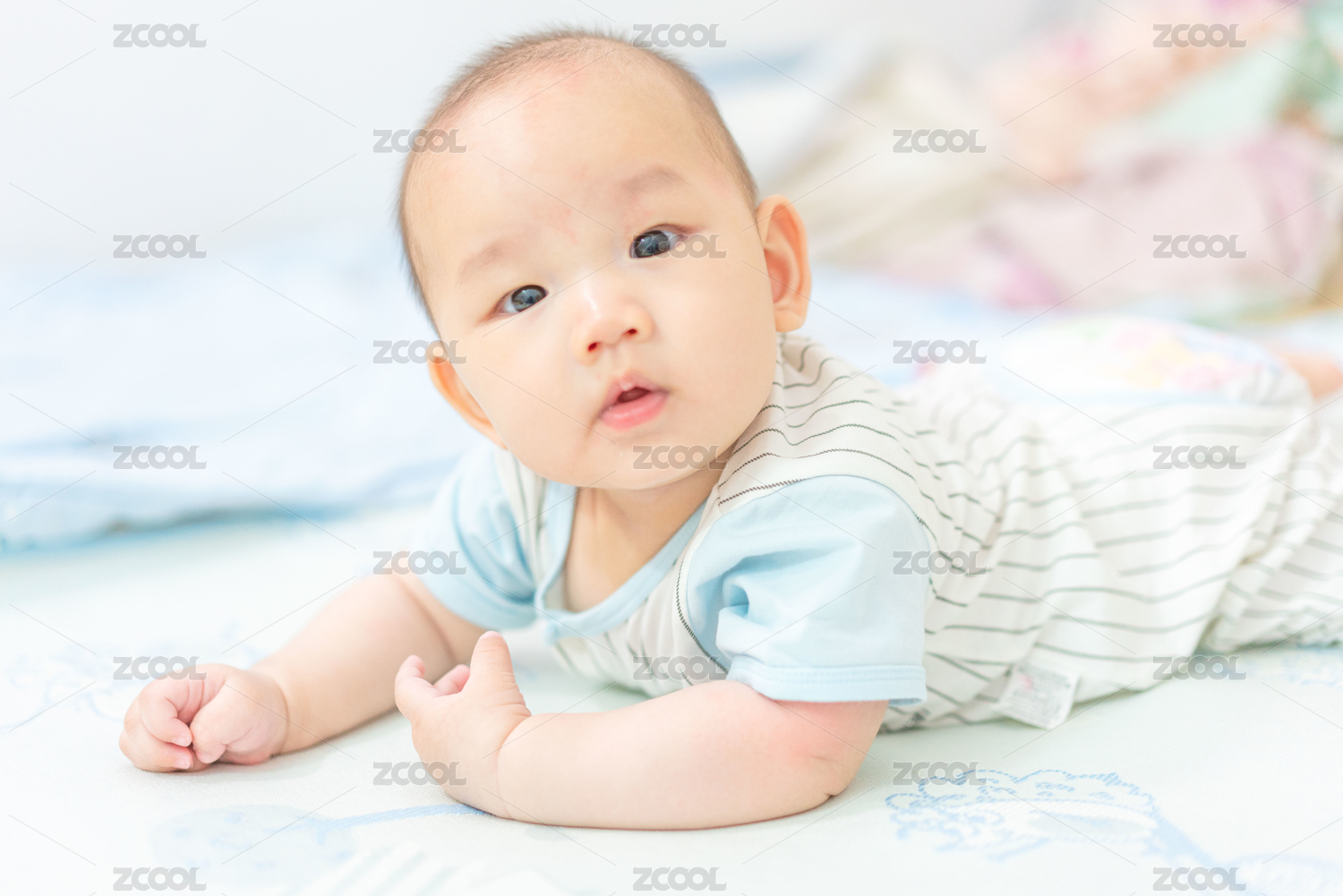 一个亚洲男婴儿趴在床上对着镜头微笑