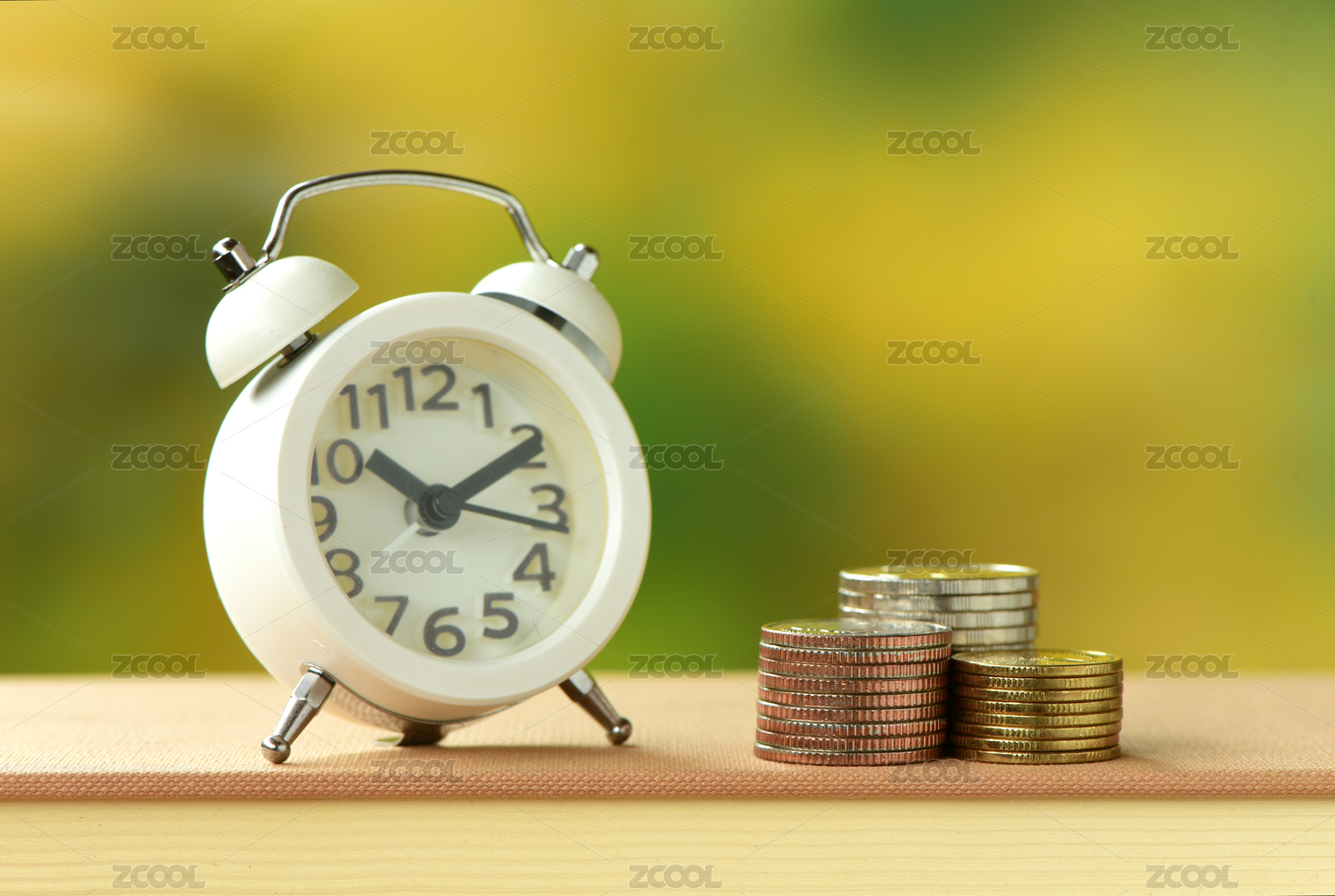 闹钟和一排美元硬币及往上继续摆放钱币的手组成的金融概念