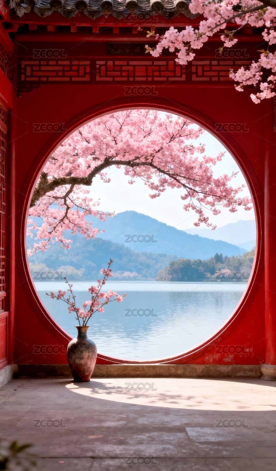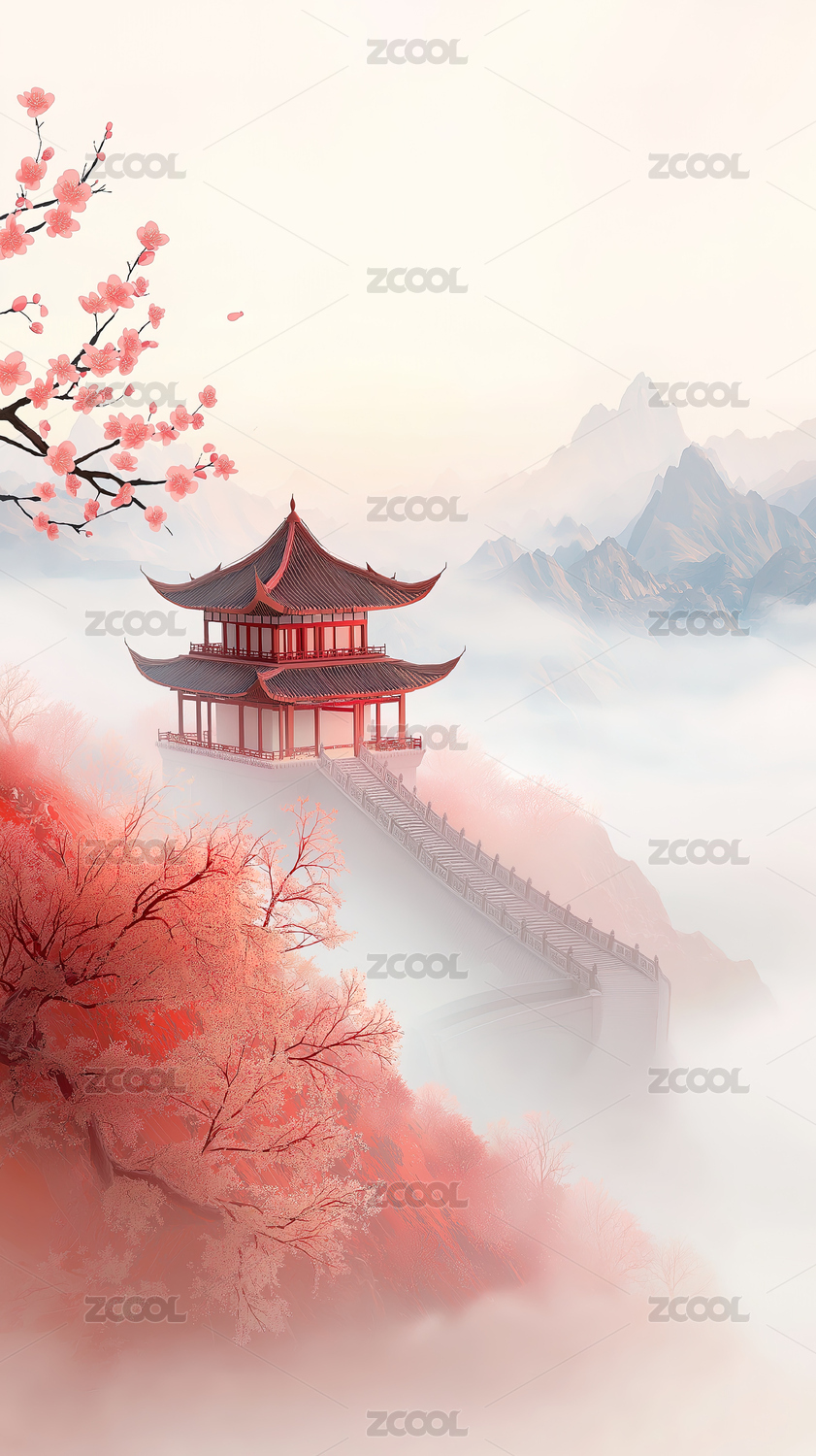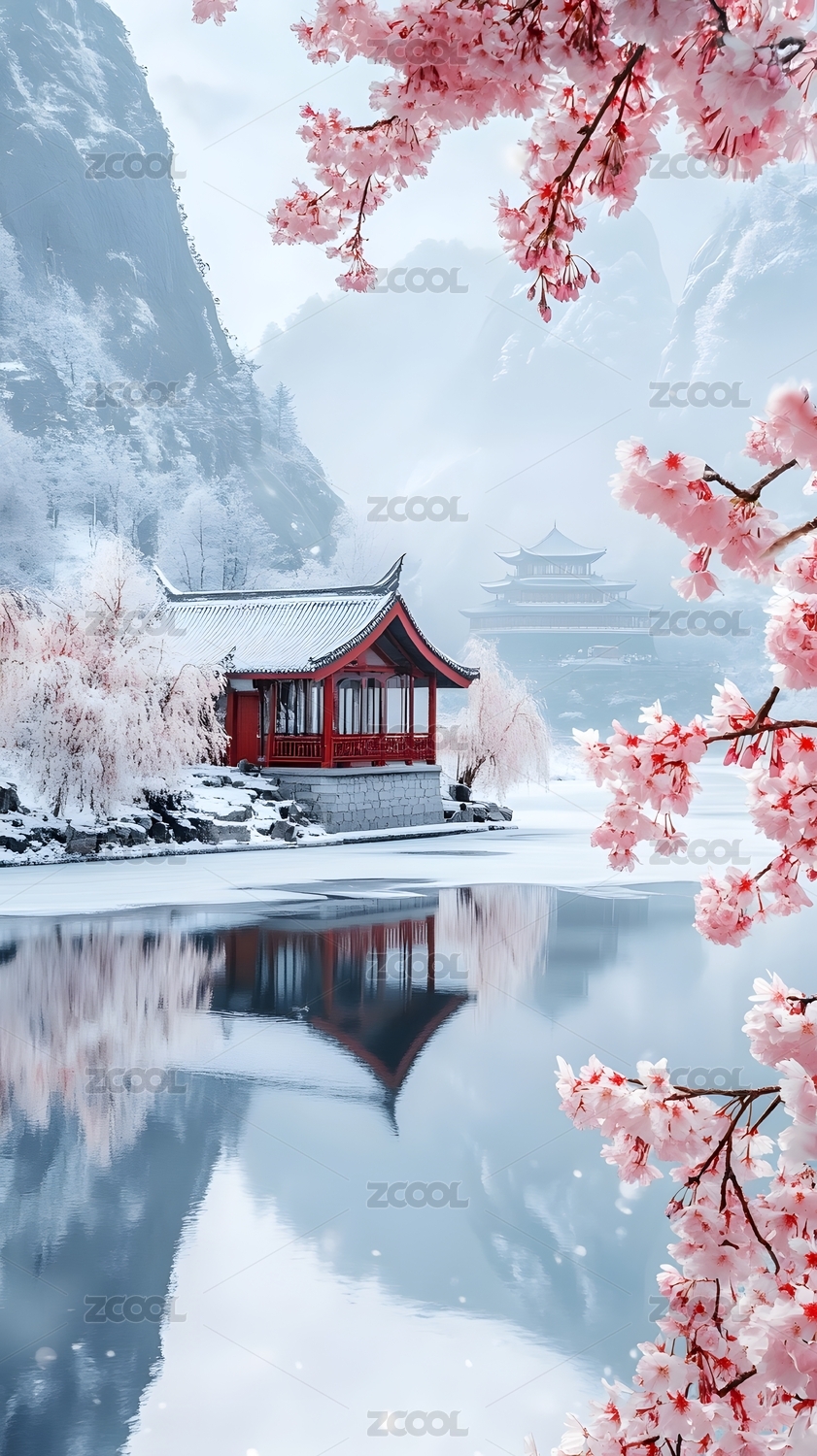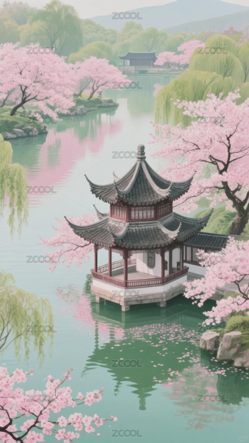 宁静,倒影,树木,宝塔,建筑,插画,艺术,3D,东方,三维