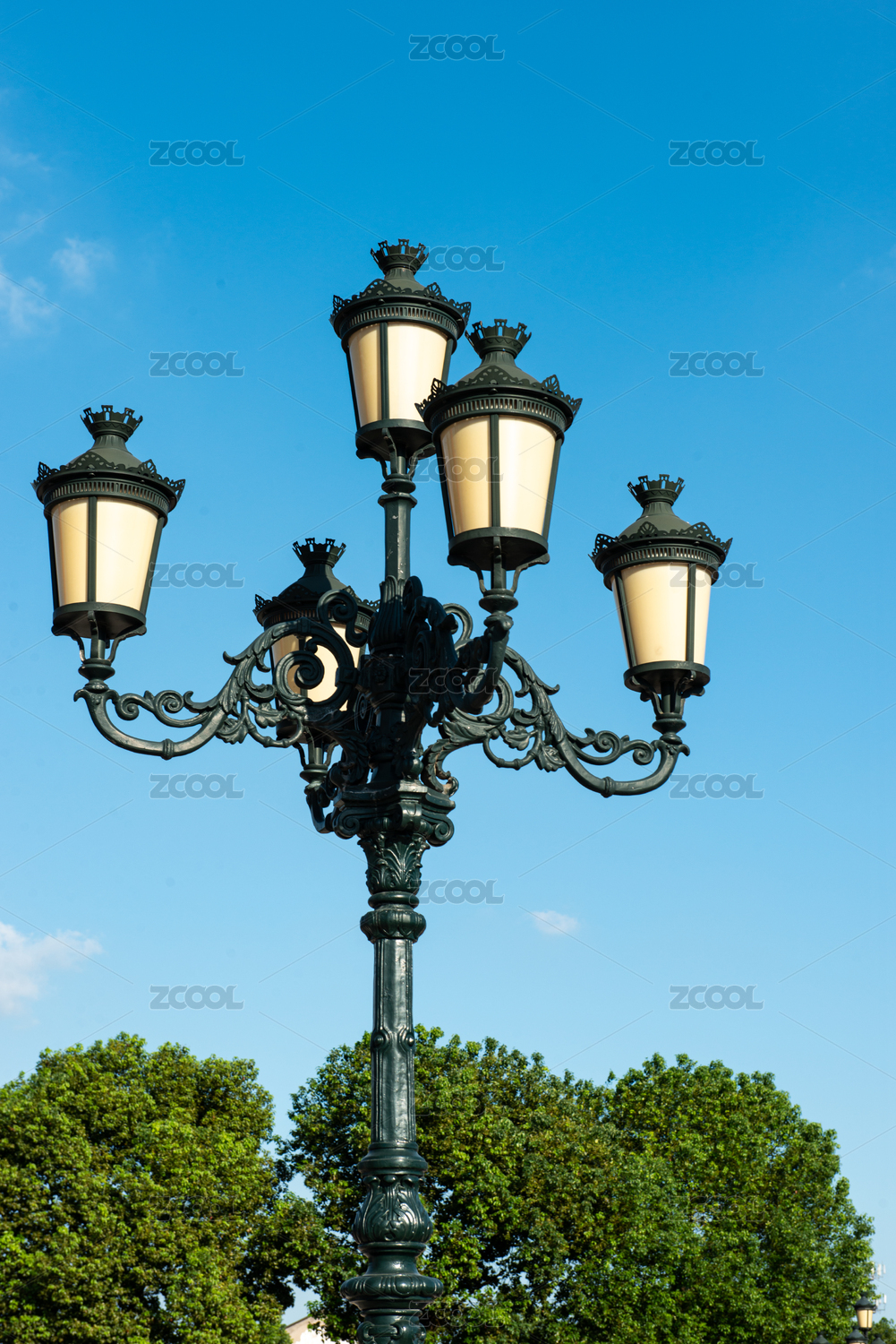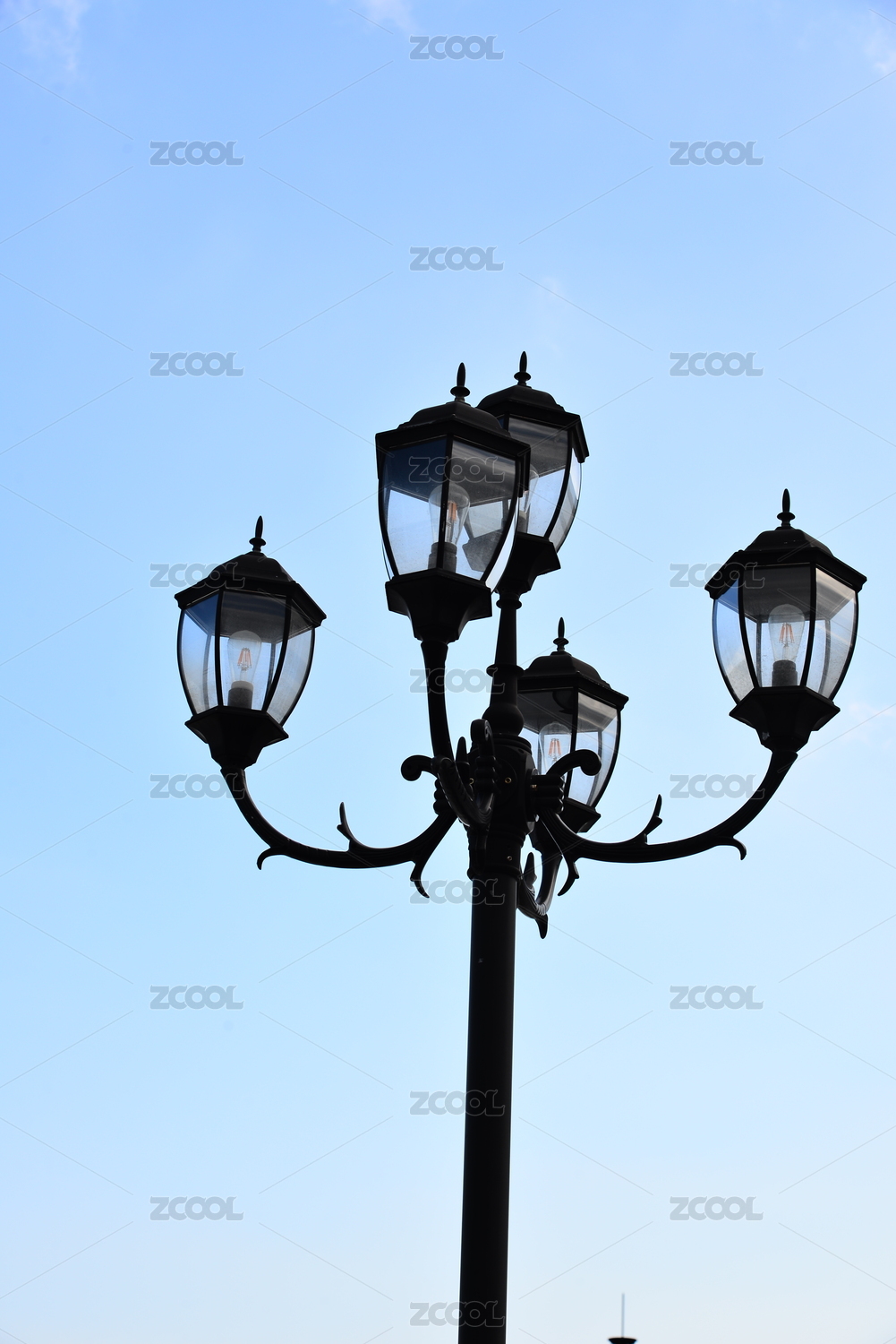 仰视墨绿色的欧式铸铁灯柱上的四盏路灯
