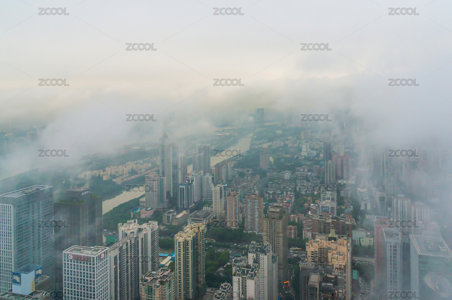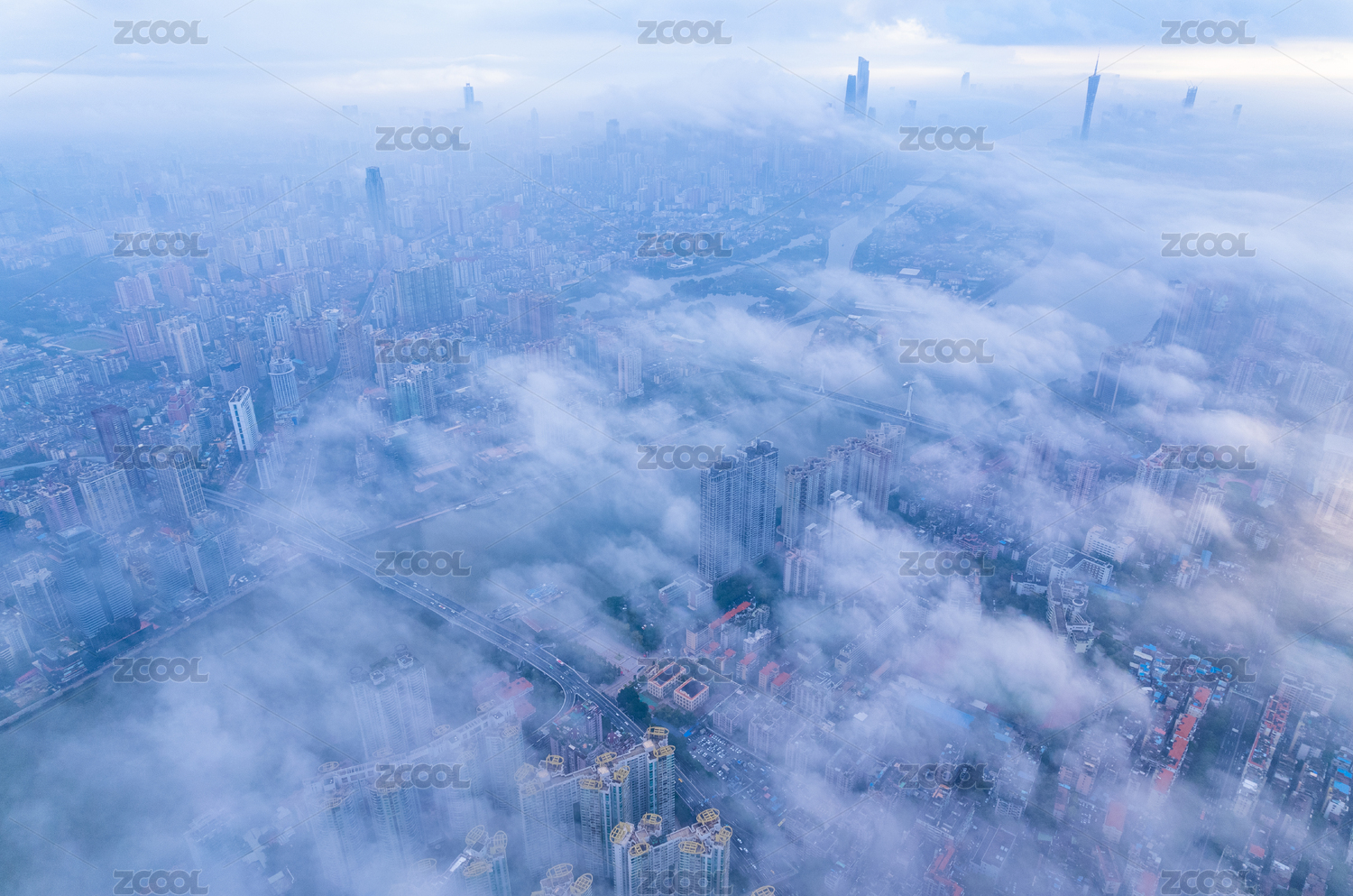 广州珠江岸城市高楼与云雾缭绕风光航拍