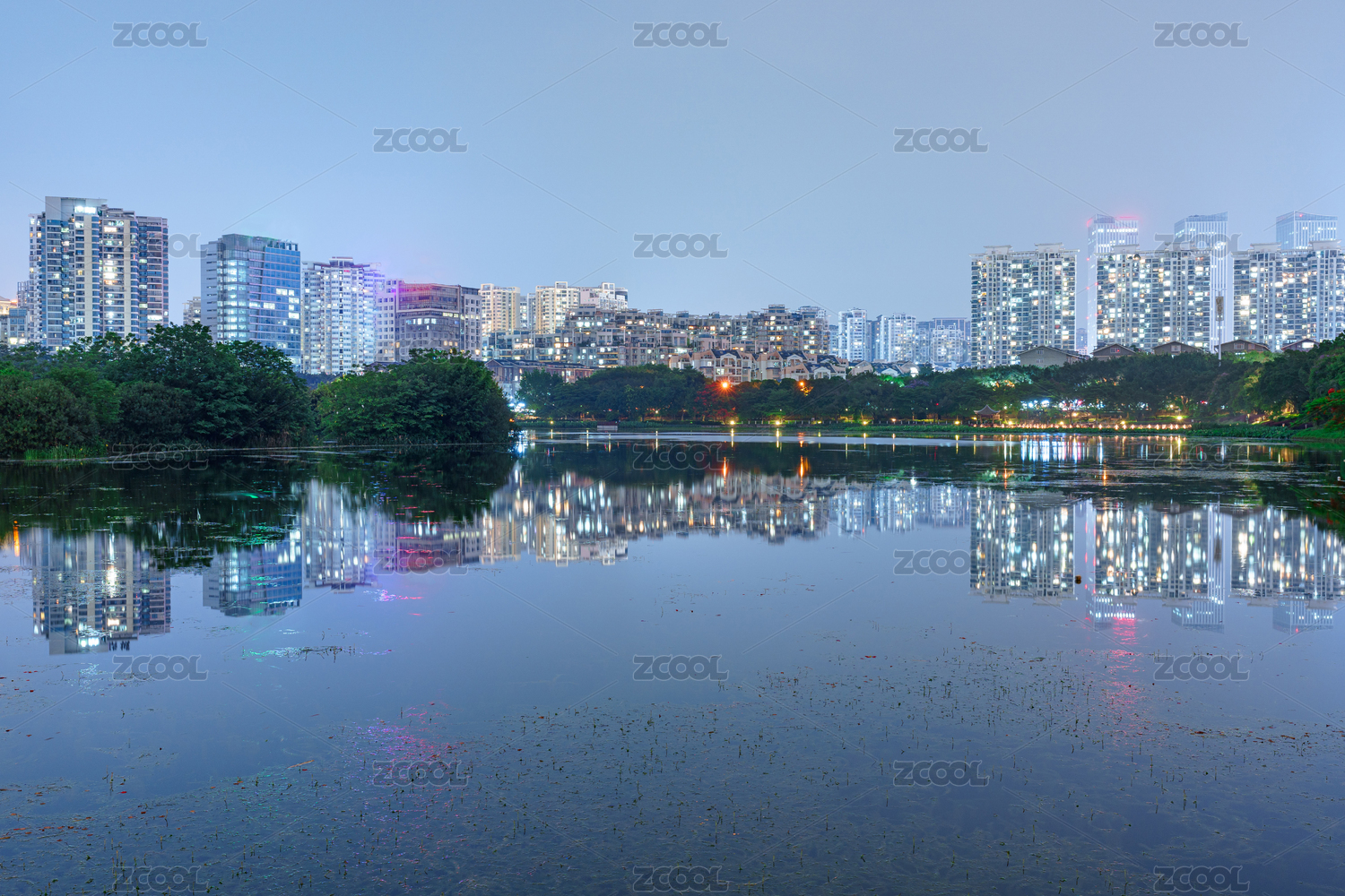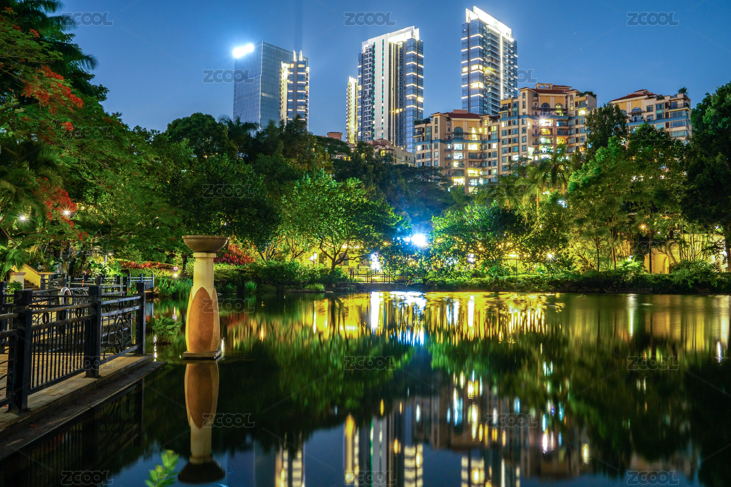 广西南宁南湖公园与城市摩天大楼建筑夜景