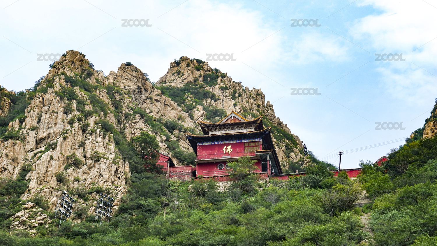 中国山西北岳恒山峭壁上的古寺庙一角风光