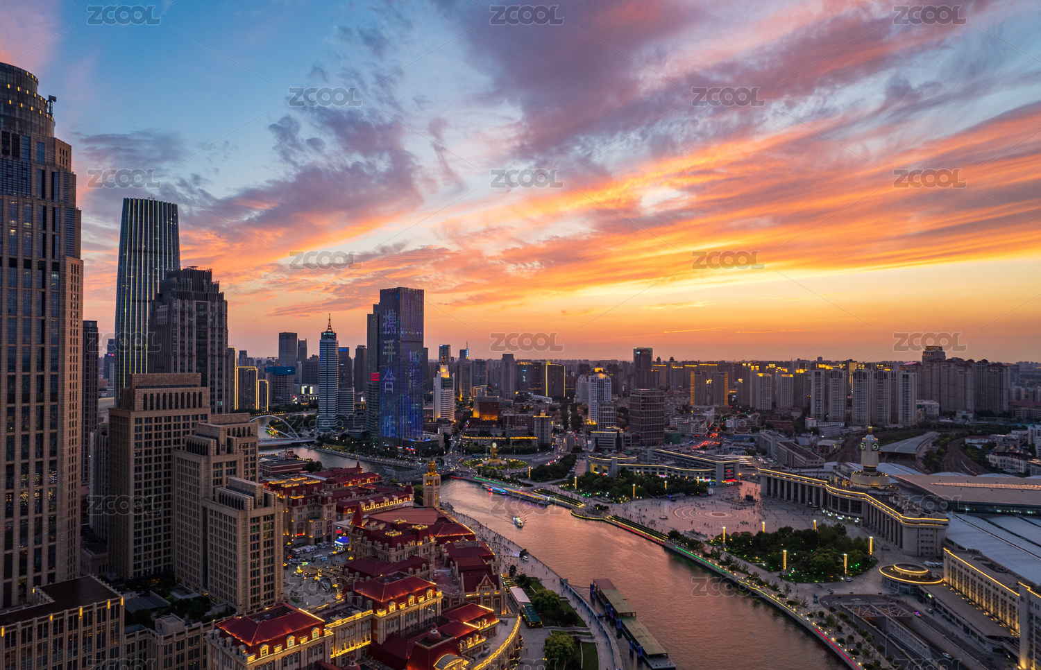 天津环球金融中心海河沿岸城市建筑日落晚霞