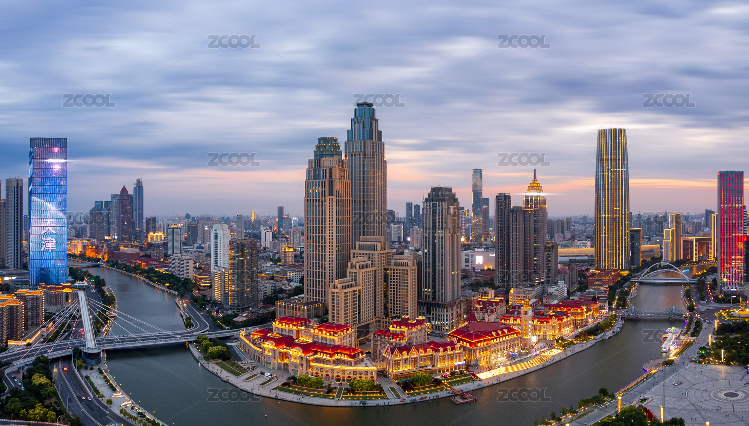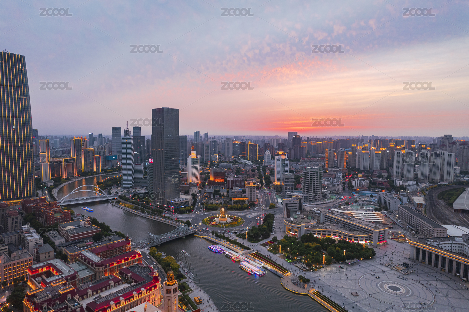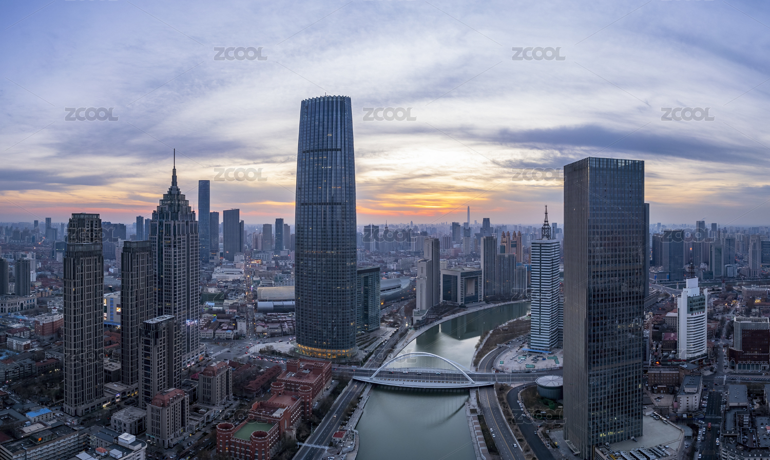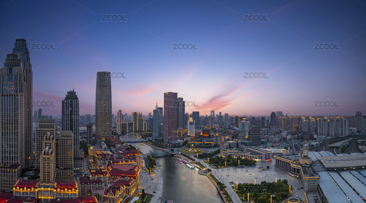 中国天津海河津湾环球金融中心日落城市风光