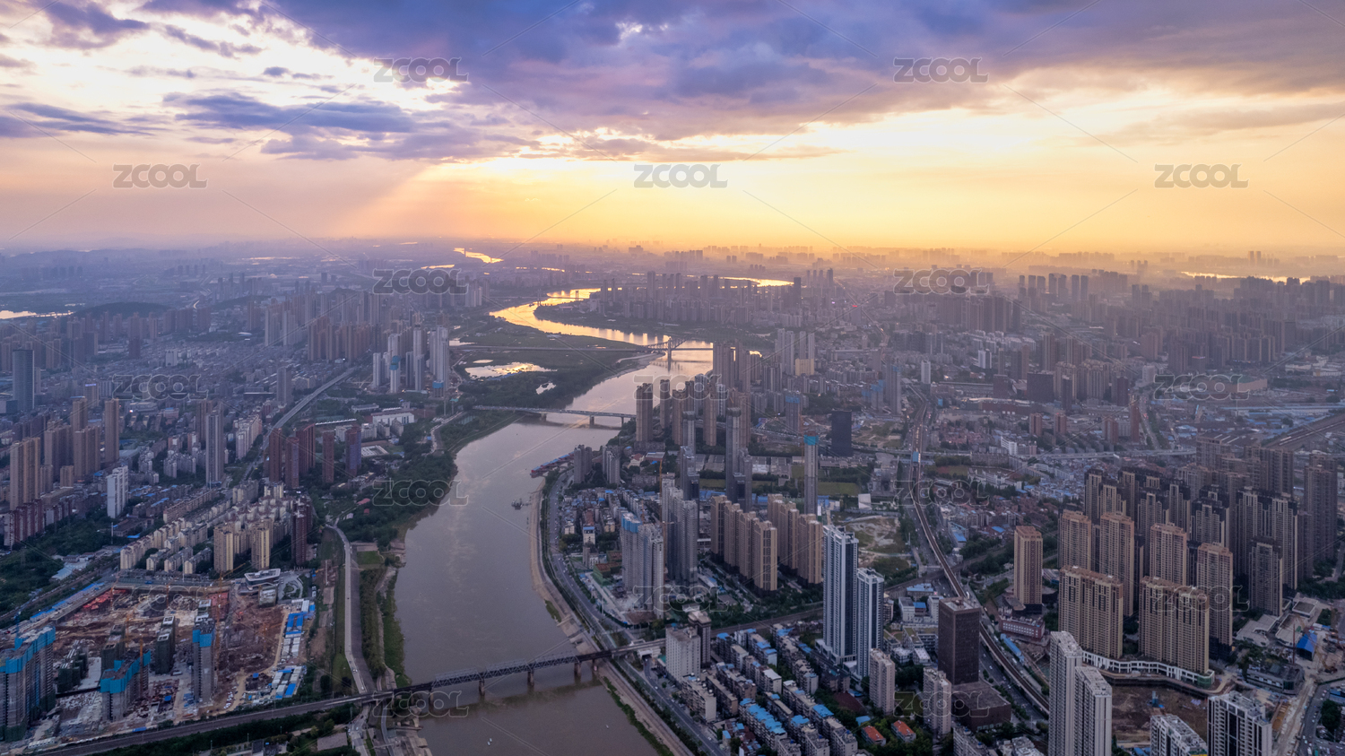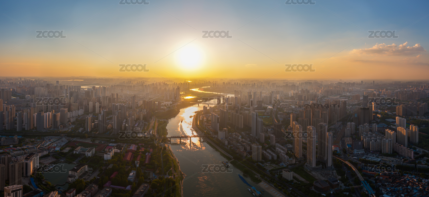 航拍夕阳下中国辽宁沈阳浑河两岸都市风光