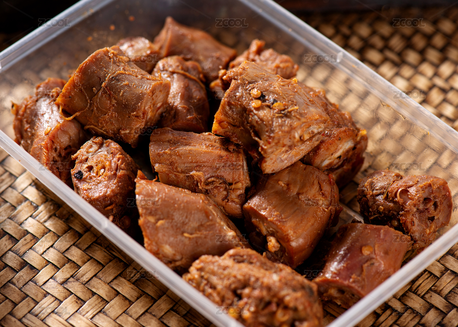 木纹背景上餐盒中摆放的黑鸭鸭脖