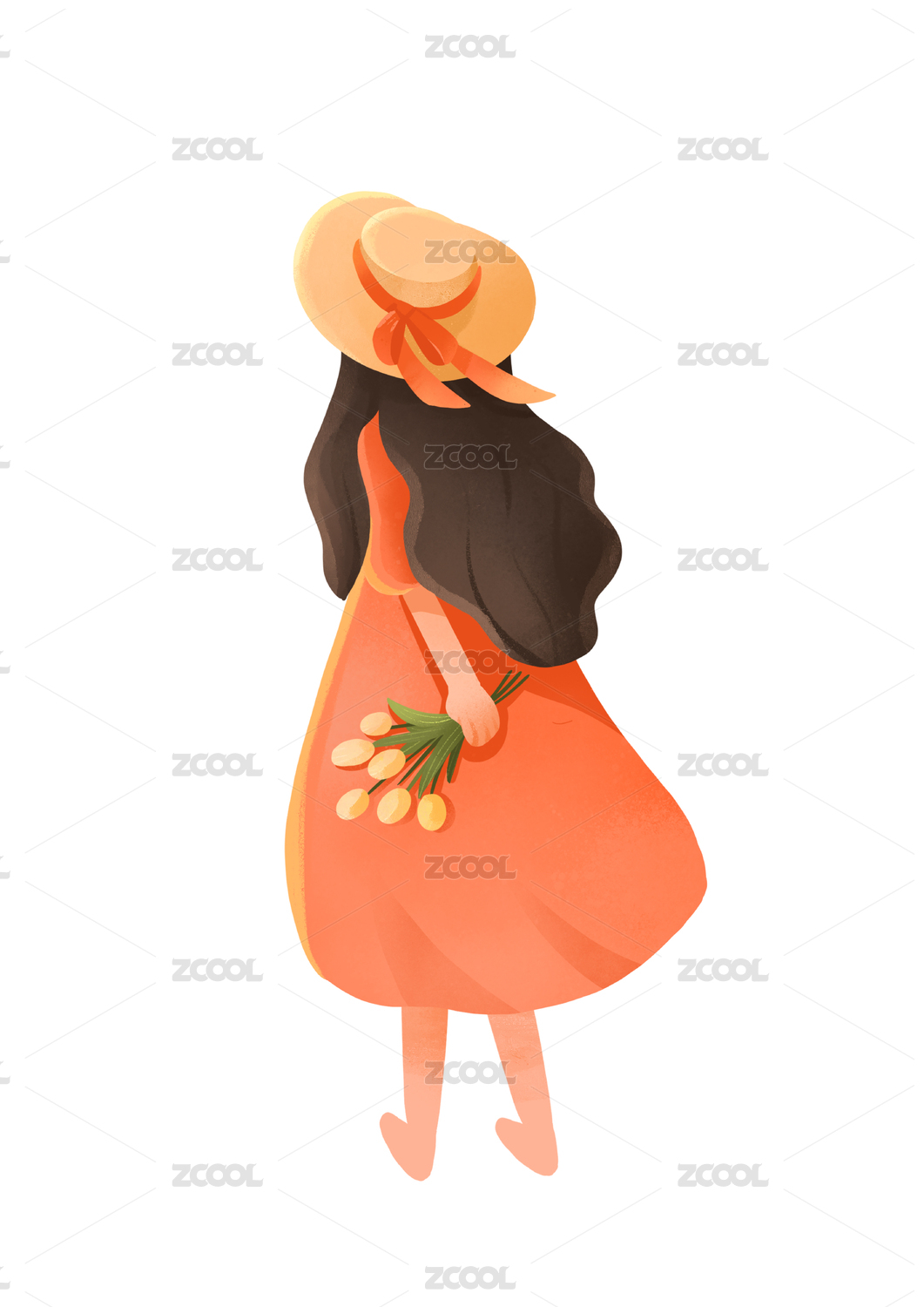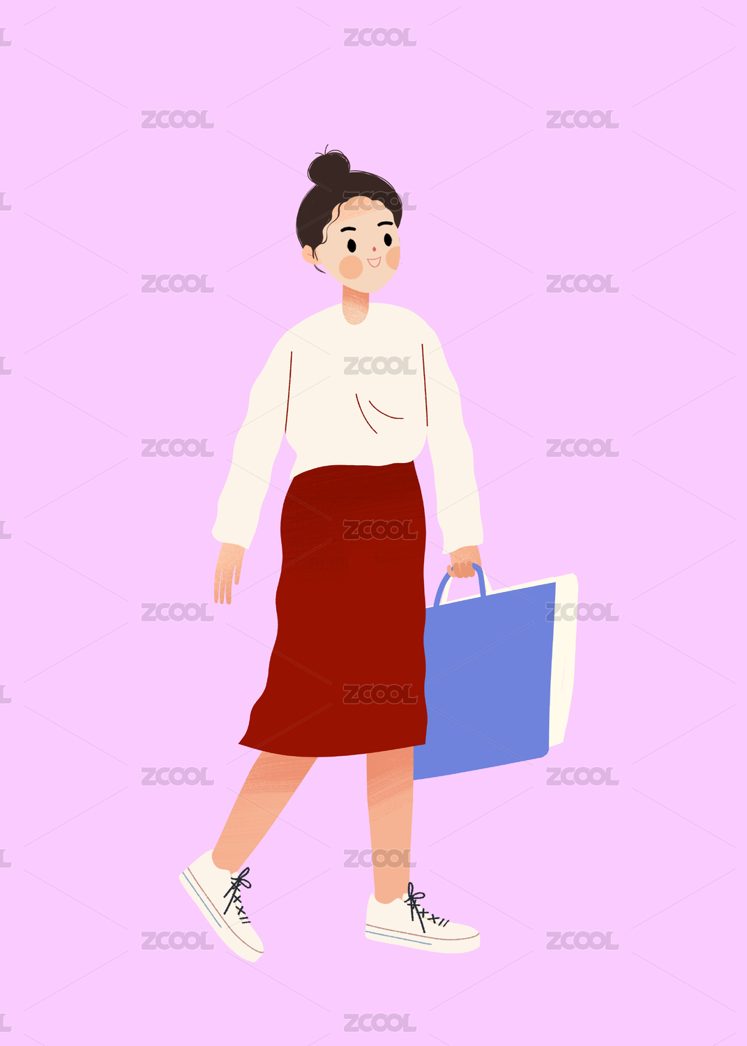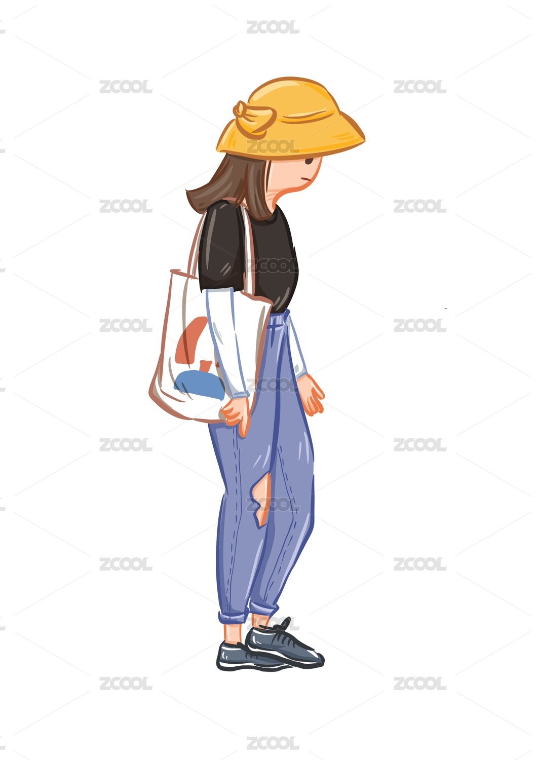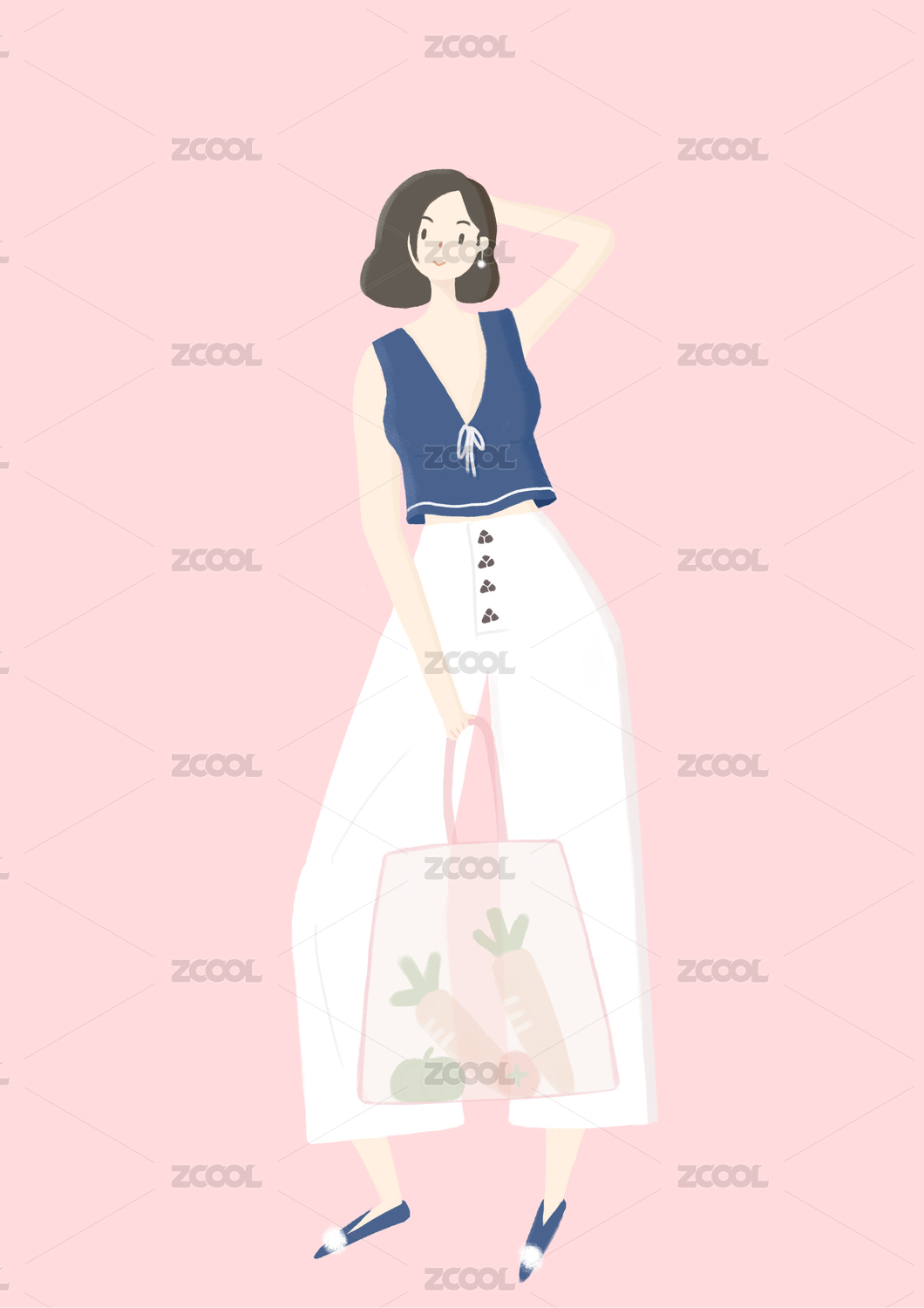 拿咖啡背斜挎包长卷发的时尚女孩插画