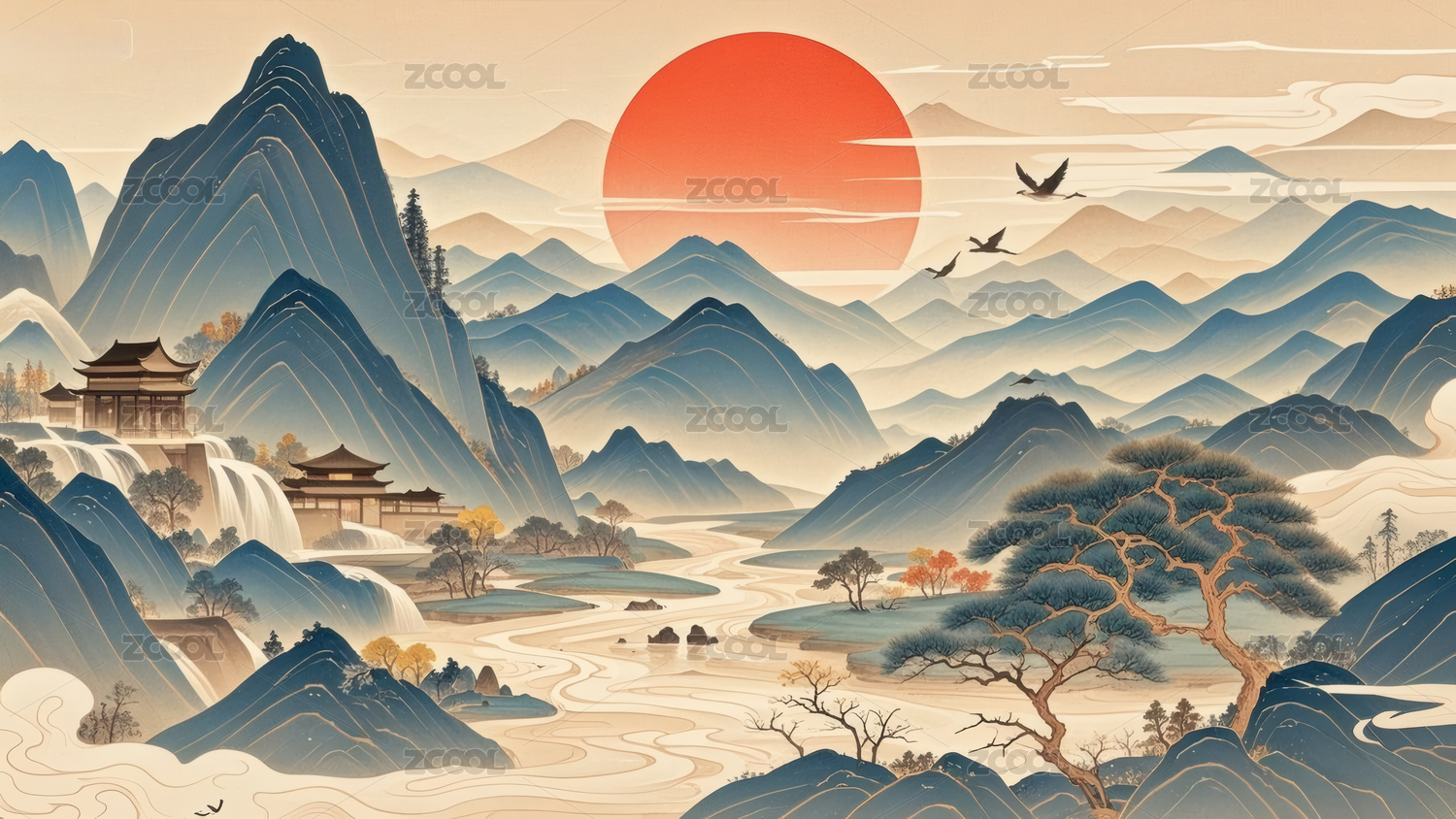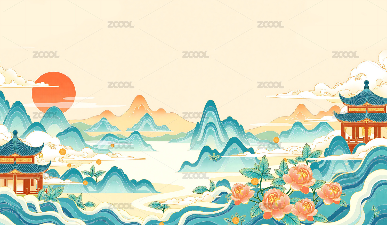 颜色鲜明的工笔画风格中式建筑国风山水插画