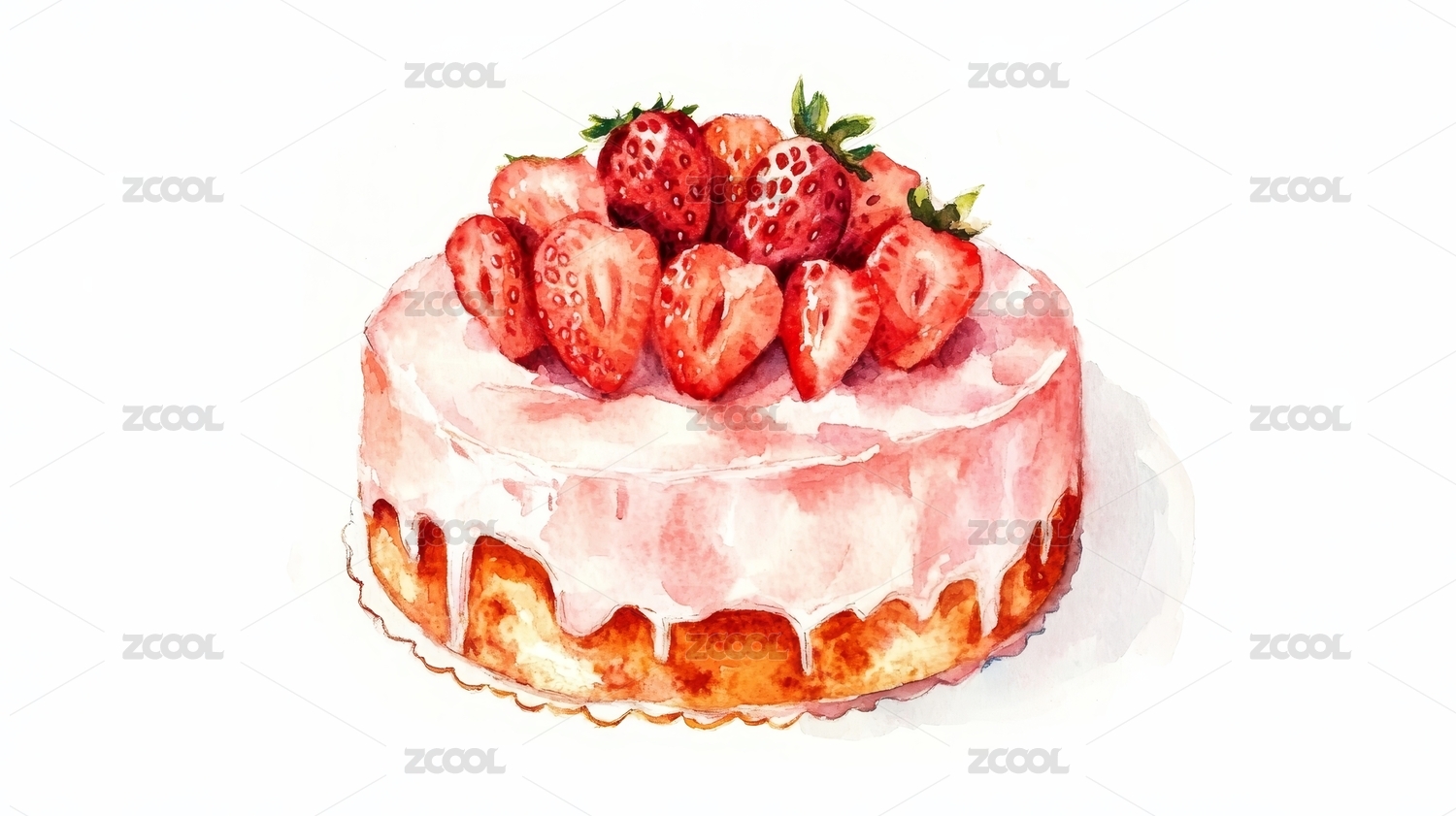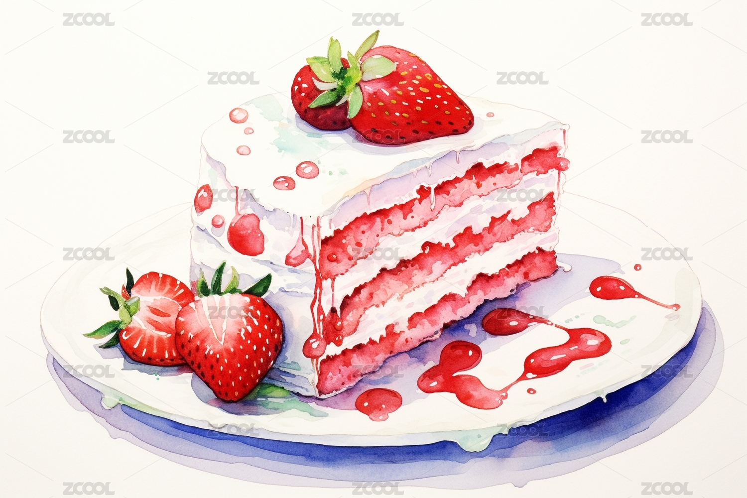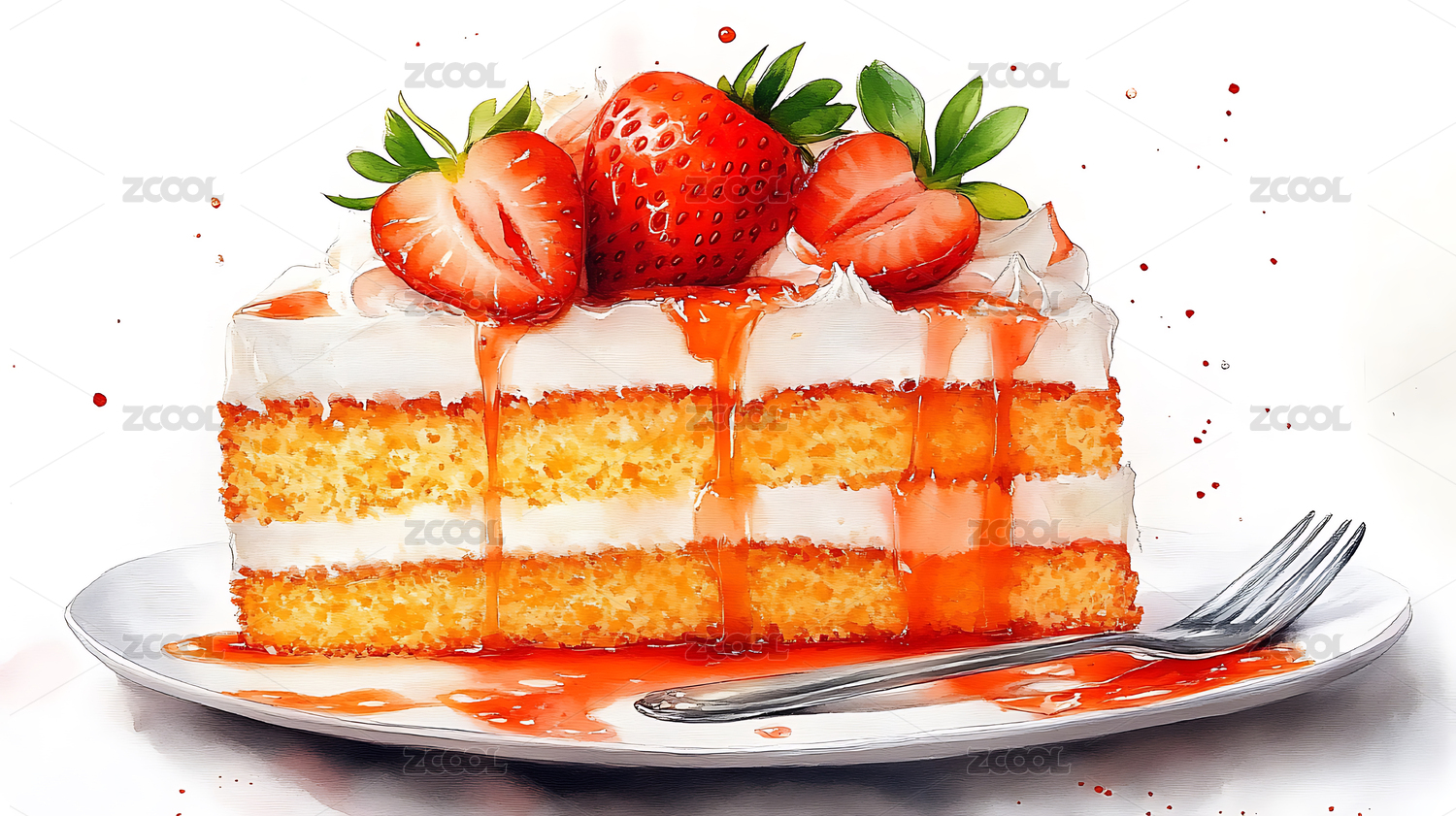 盘子上切开的水果奶油蛋糕3D卡通食品插画