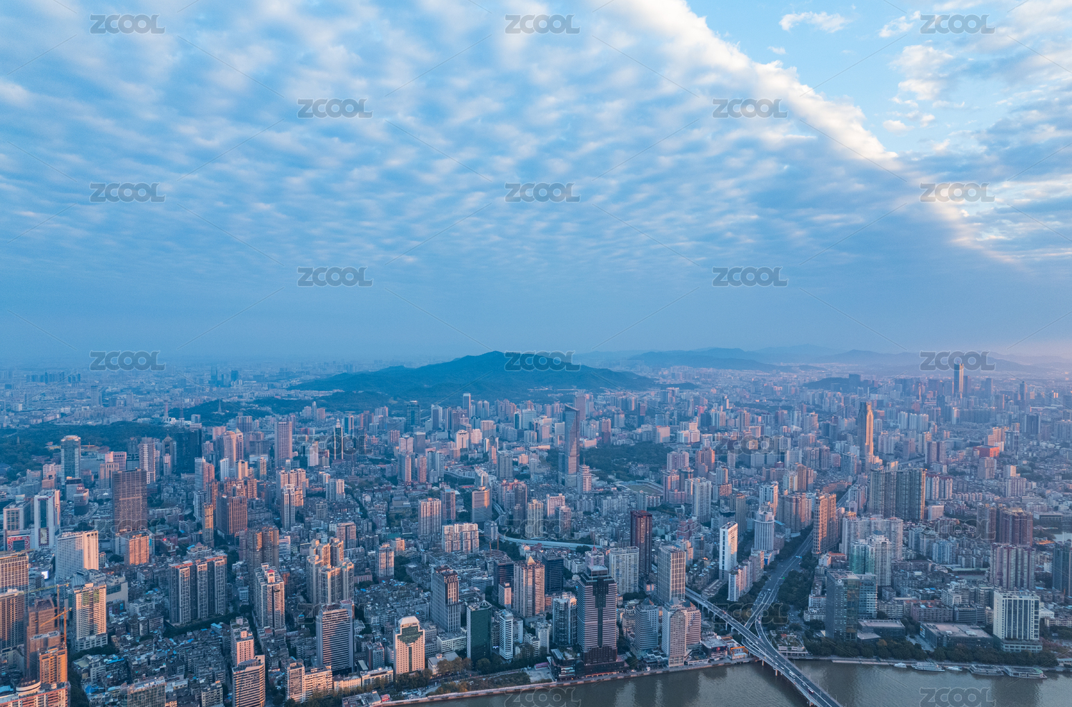 广州城市密集建筑群与日出云彩航拍风光