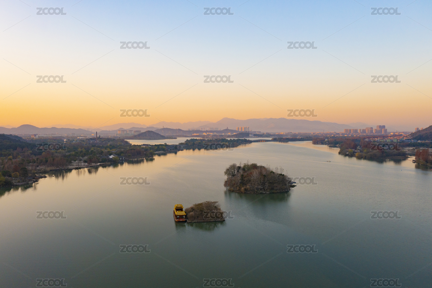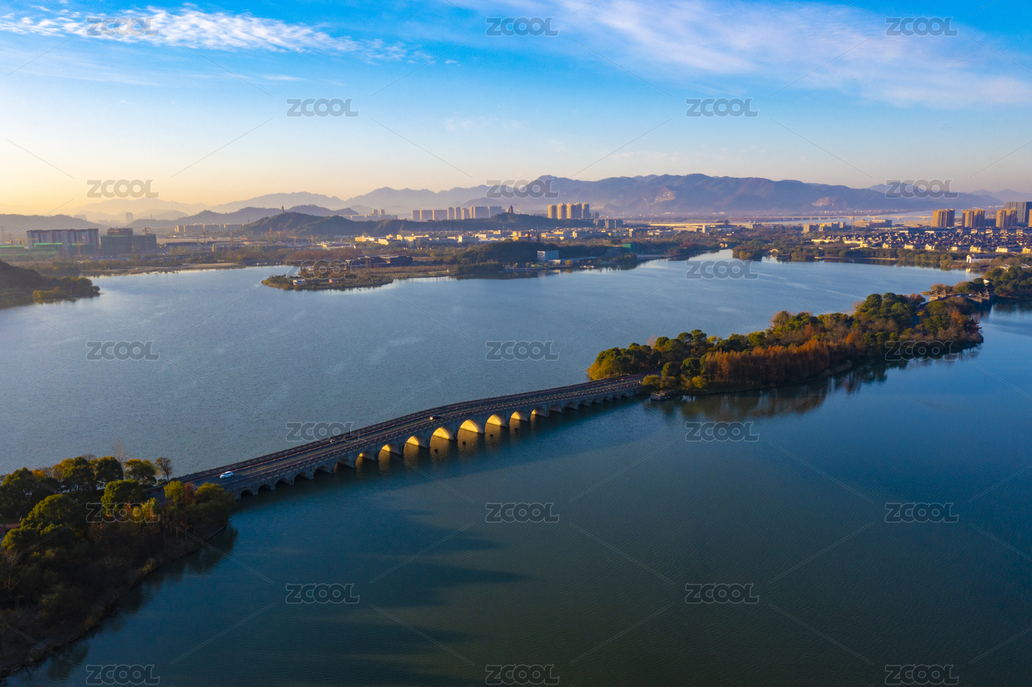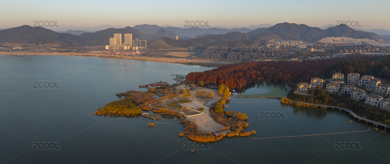 浙江省杭州市湘湖景区秋色晨曦航拍