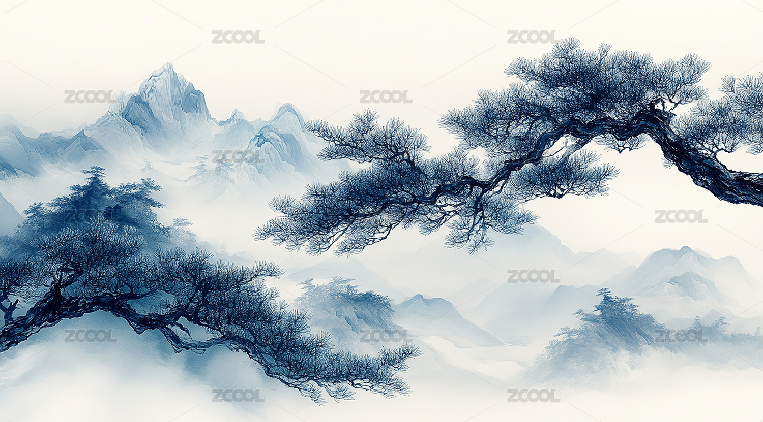 水墨青山云雾远山松树插画