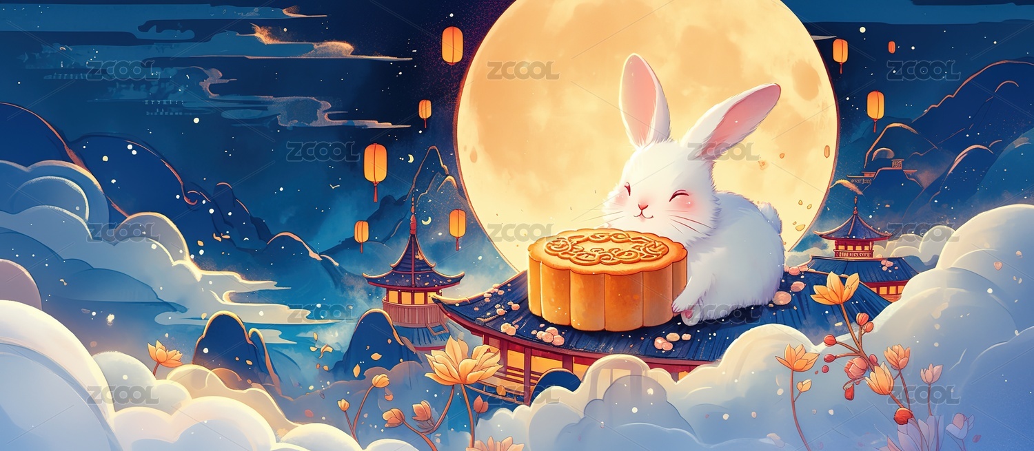中秋节嫦娥玉兔月亮卡通漫画插画
