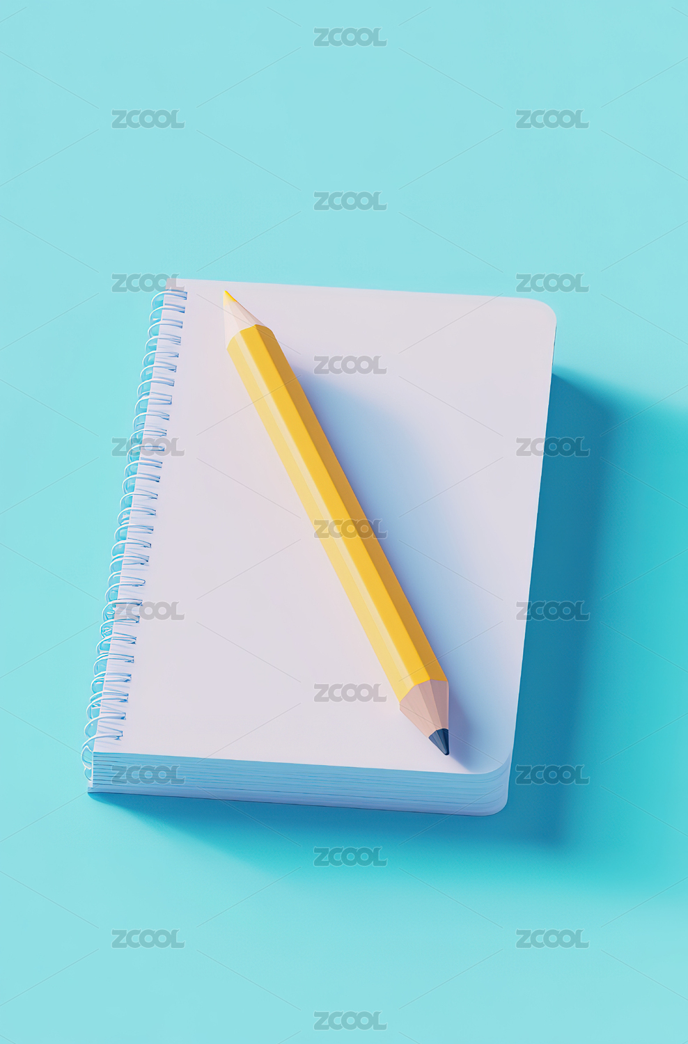 正上方蓝色背景下的螺旋笔记本和铅笔照片