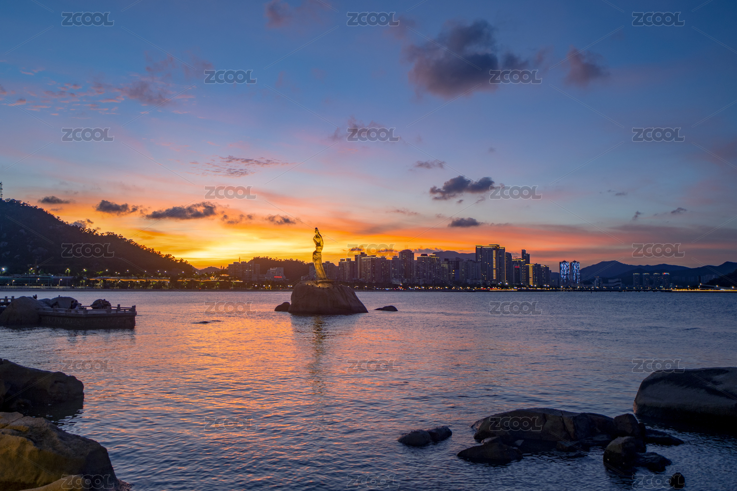 珠海香炉湾珠海渔女塑像日出彩霞满天风光