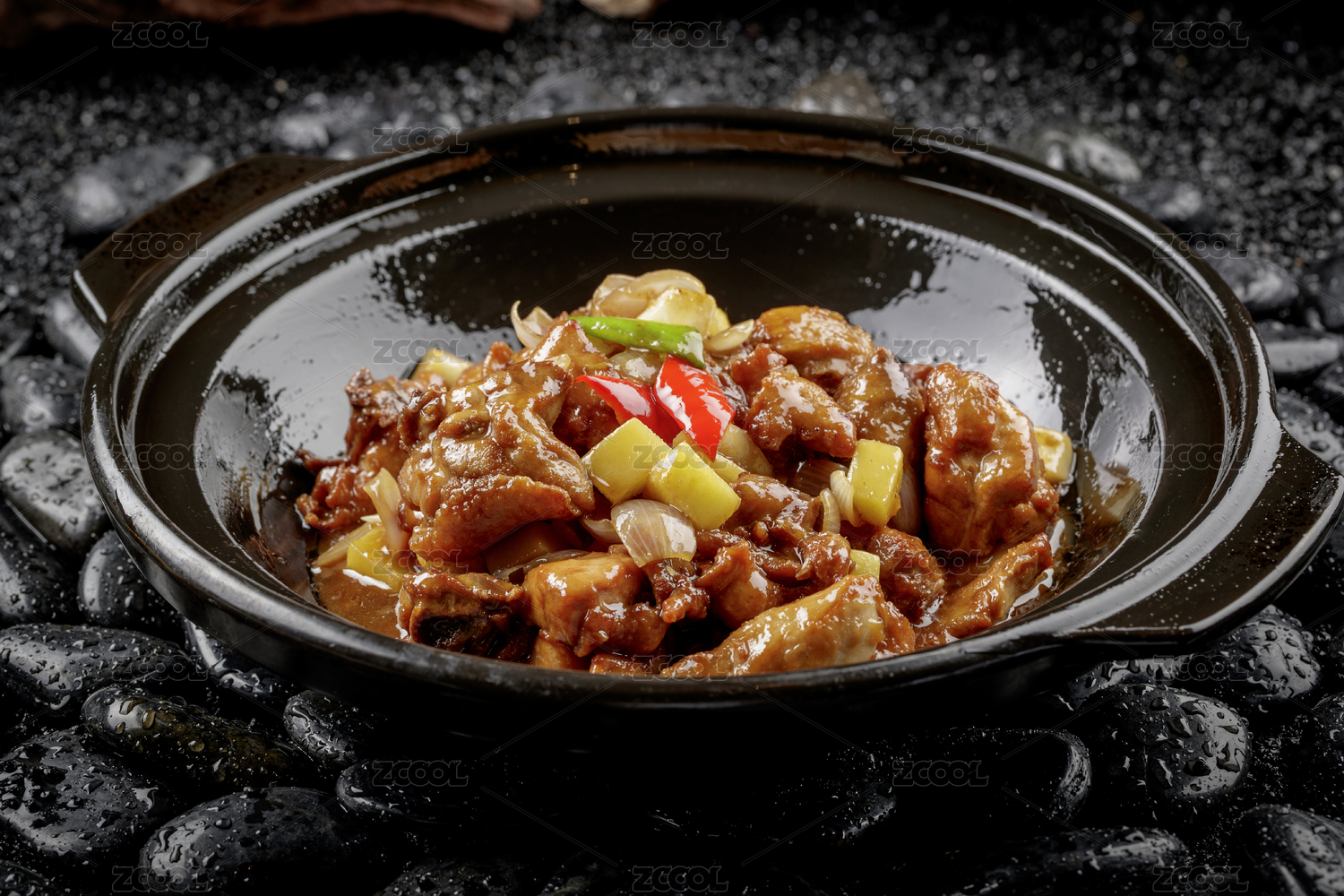 褐色砂锅装的香焖牛仔骨摆放在黑色鹅卵石上