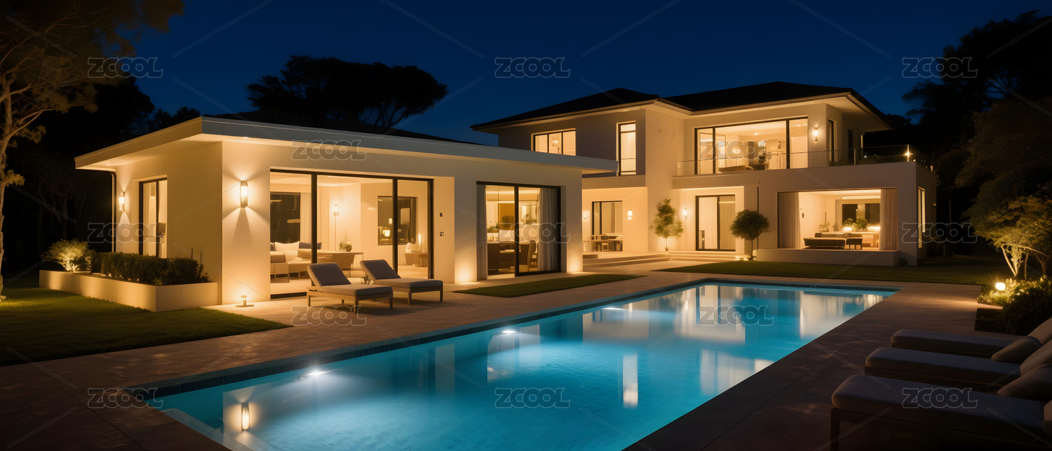 夜幕下的泳池别墅