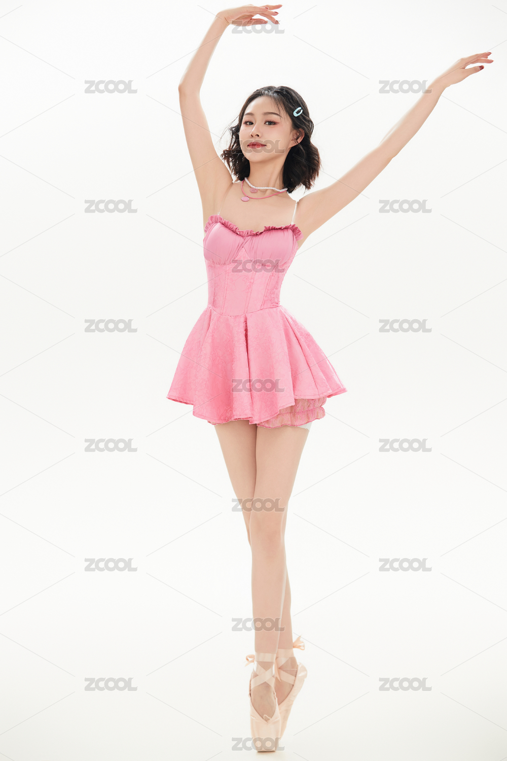身穿粉色芭蕾舞服跳舞的亚洲少女