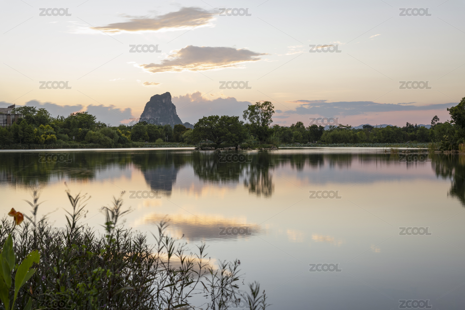 傍晚时分的连城冠豸山及其倒影,中国福建连城