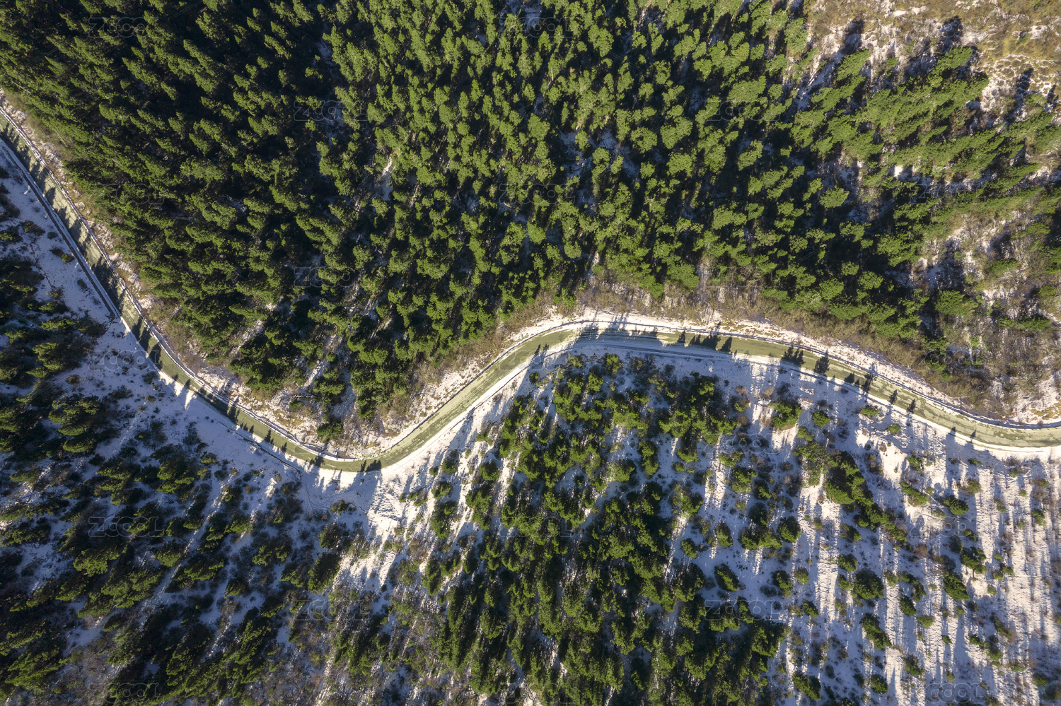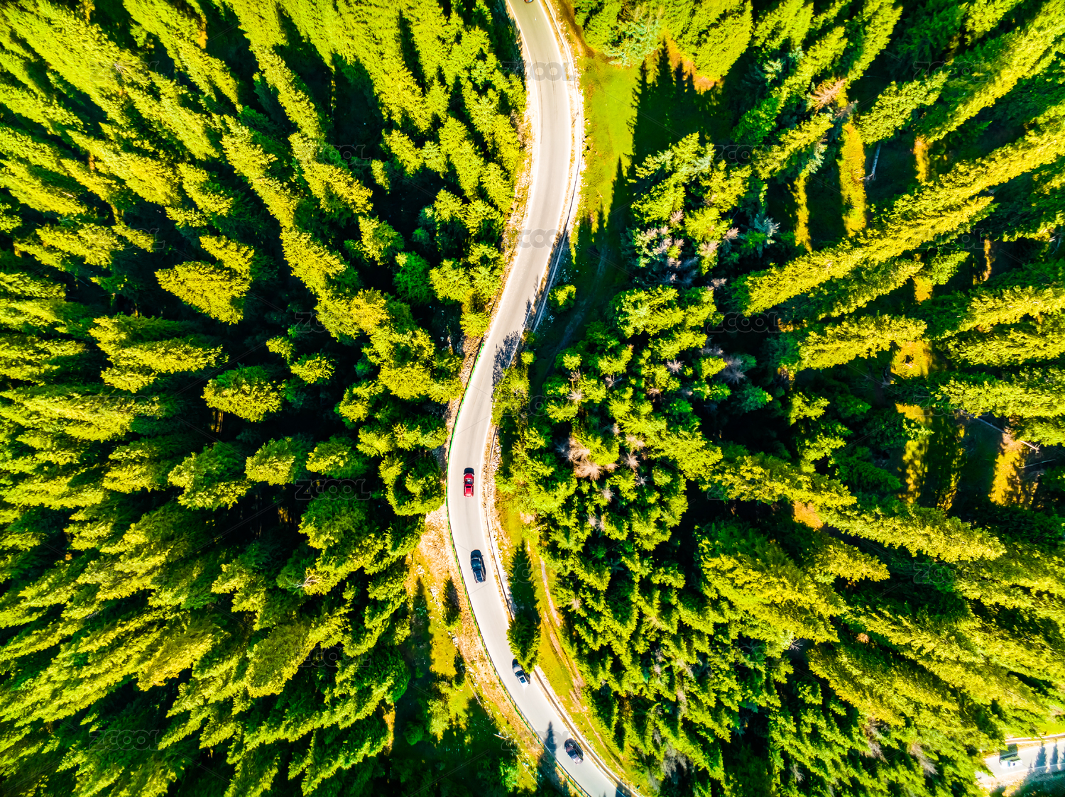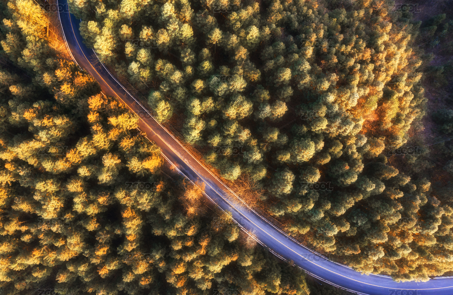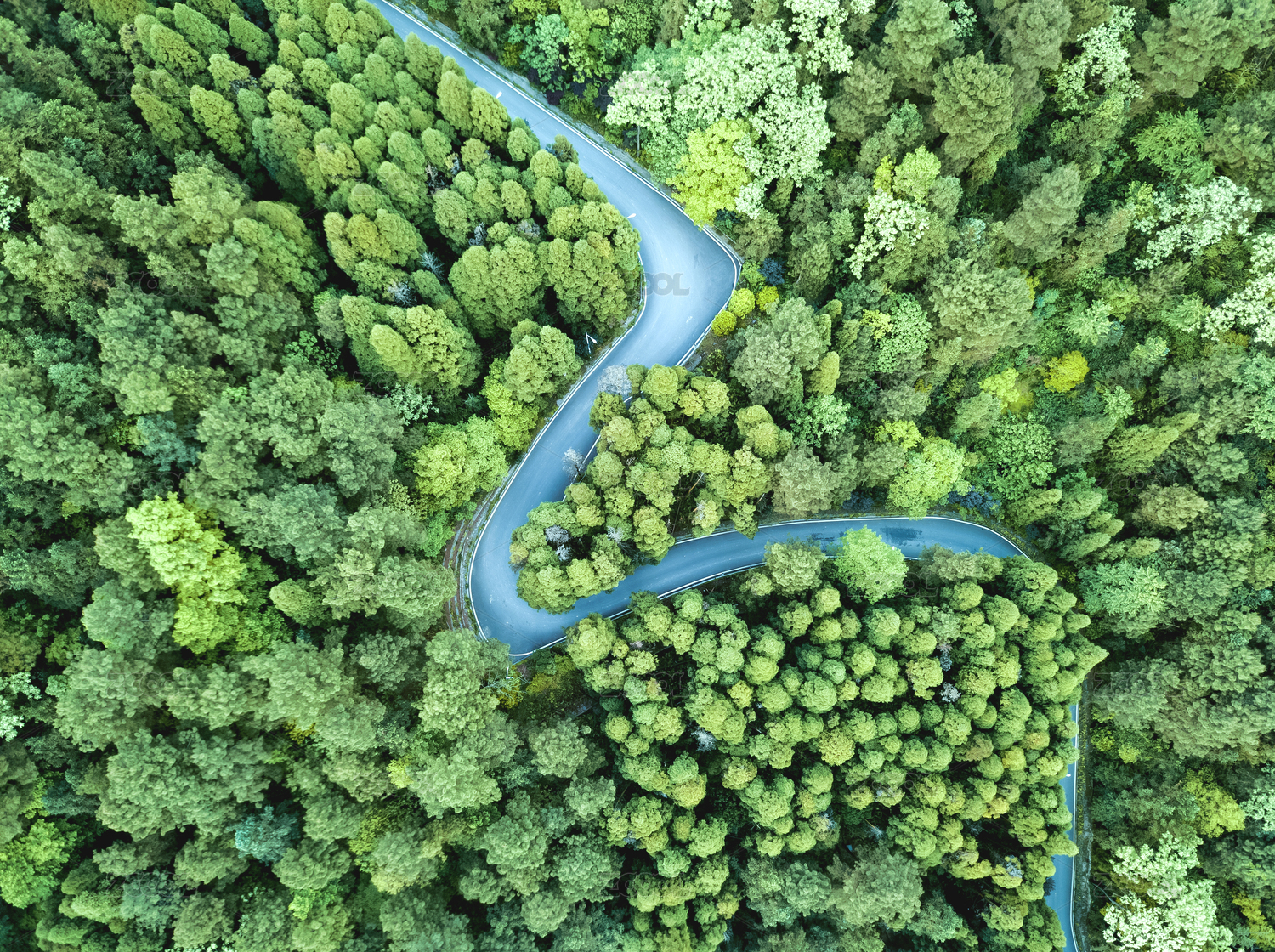 航拍俯视绿树林间弯曲蜿蜒的公路