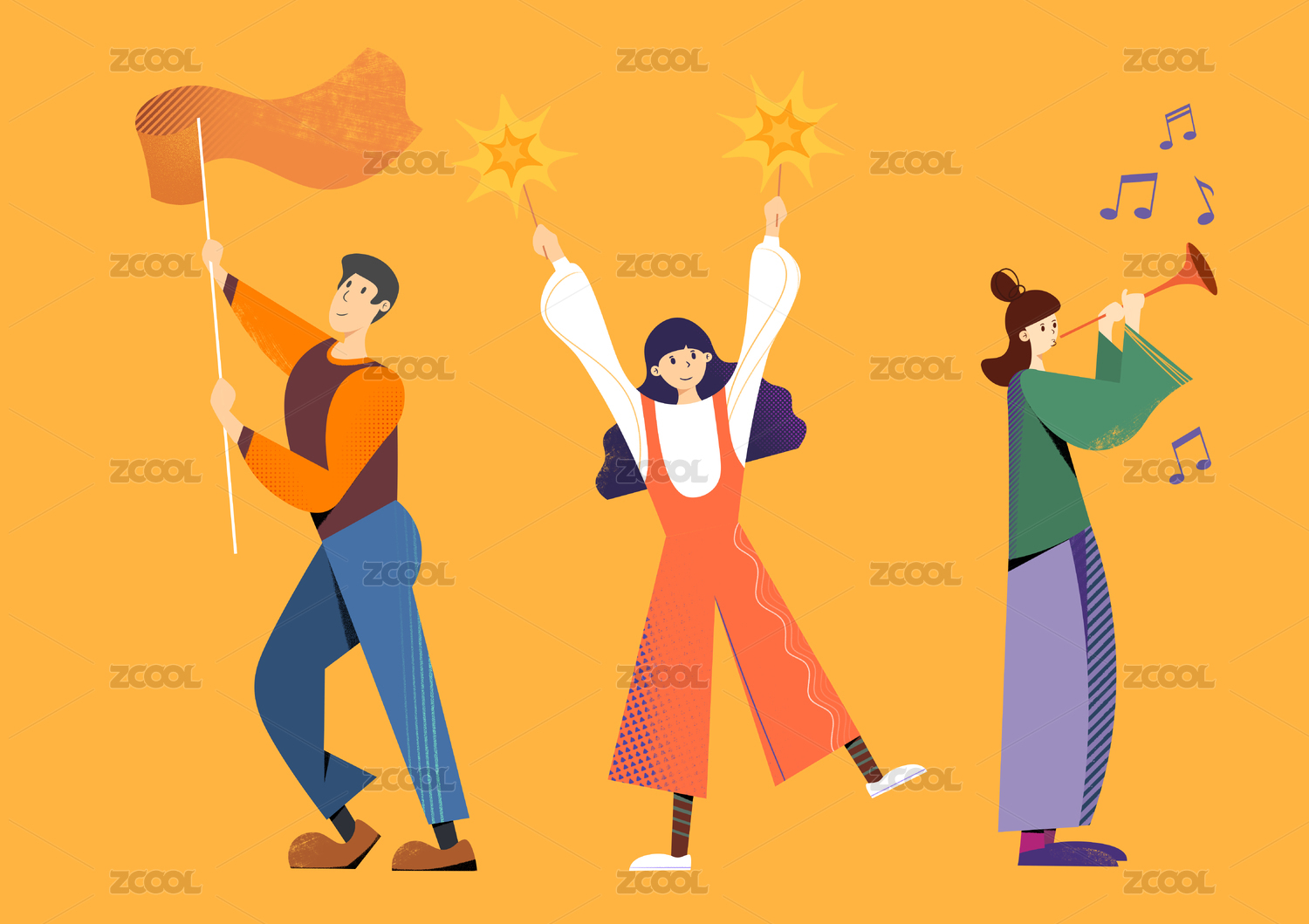 男女青年挥舞彩旗开心地庆祝新年的插画