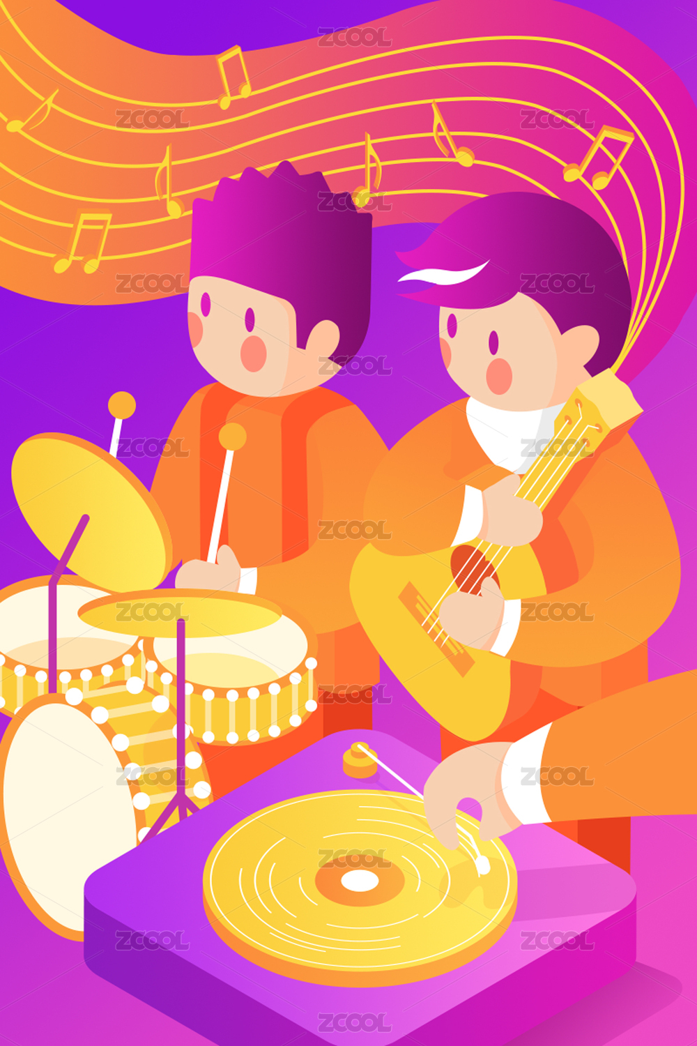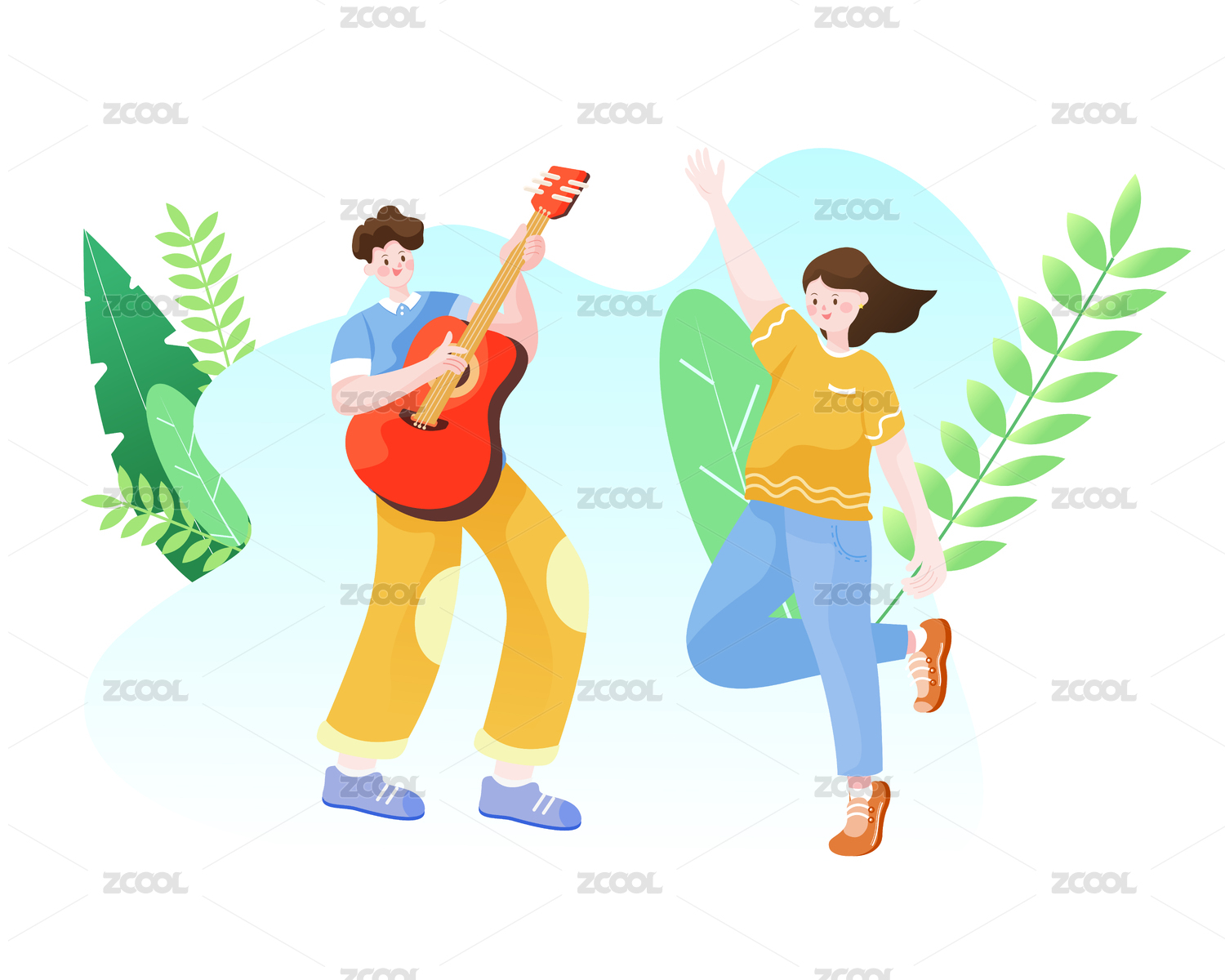 两个人开心快乐的弹奏乐器演唱音乐插画