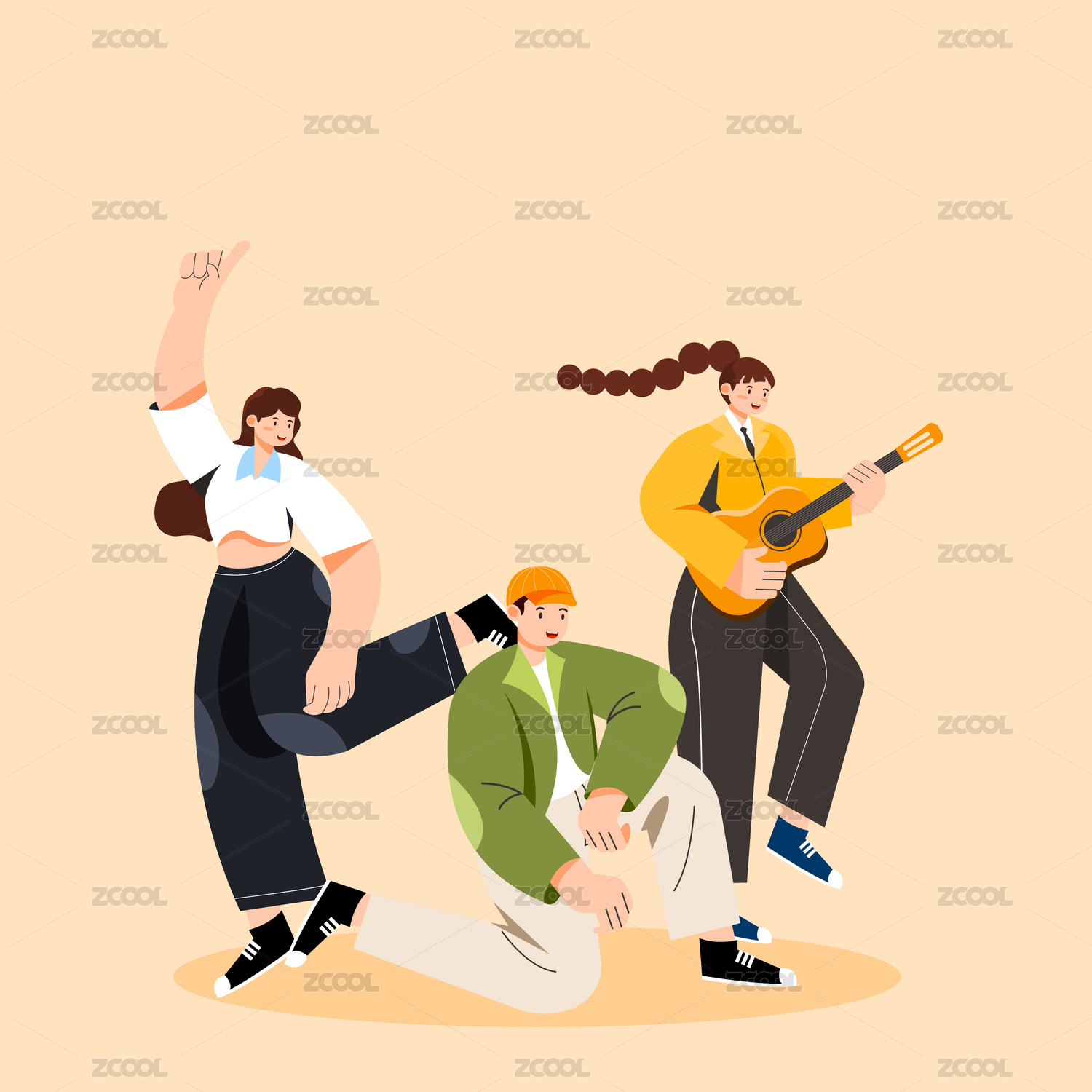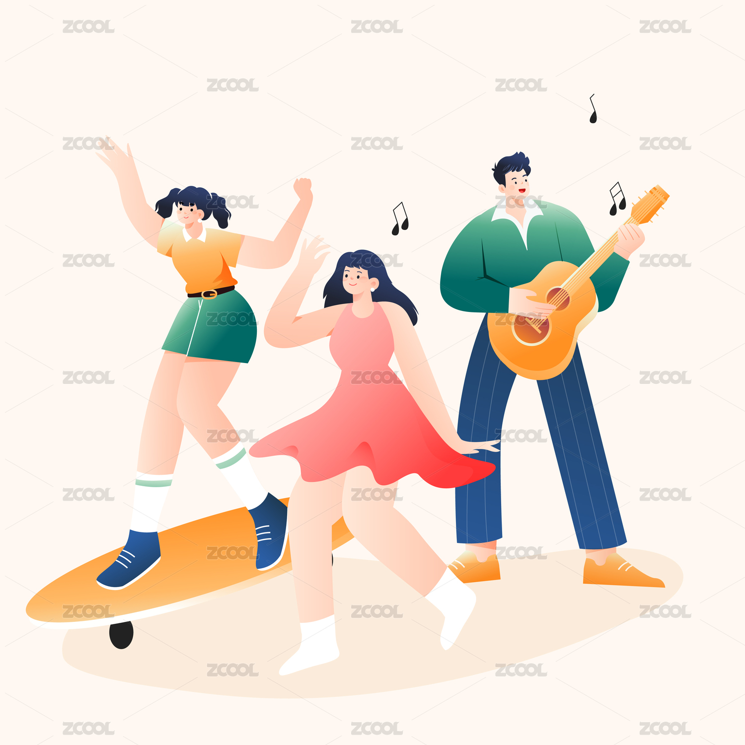 一群青年在草地弹奏音乐唱歌跳舞插画