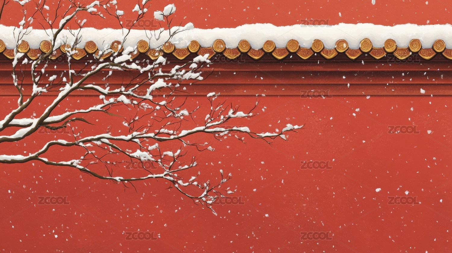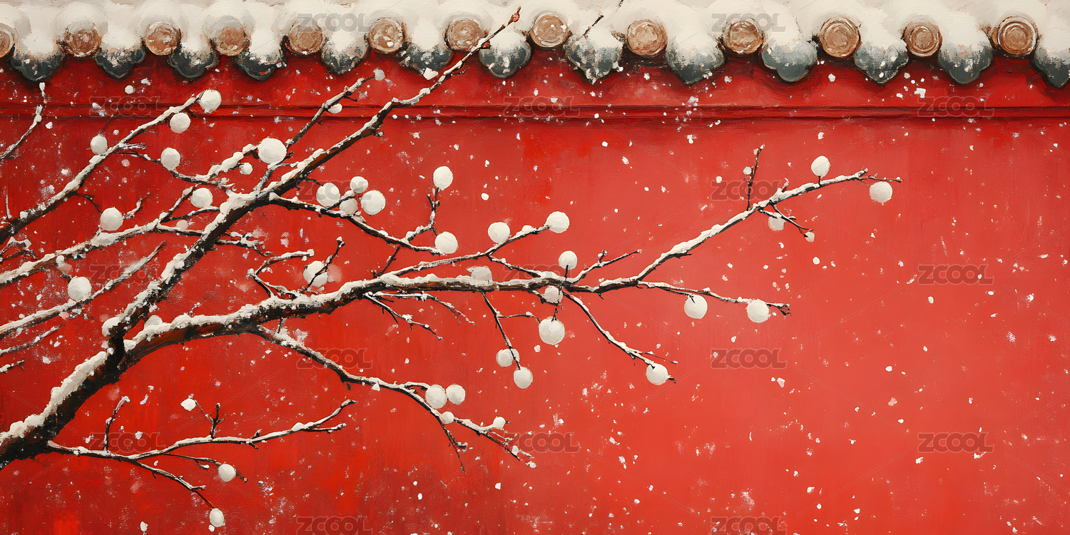 红墙白雪梅花冬景图