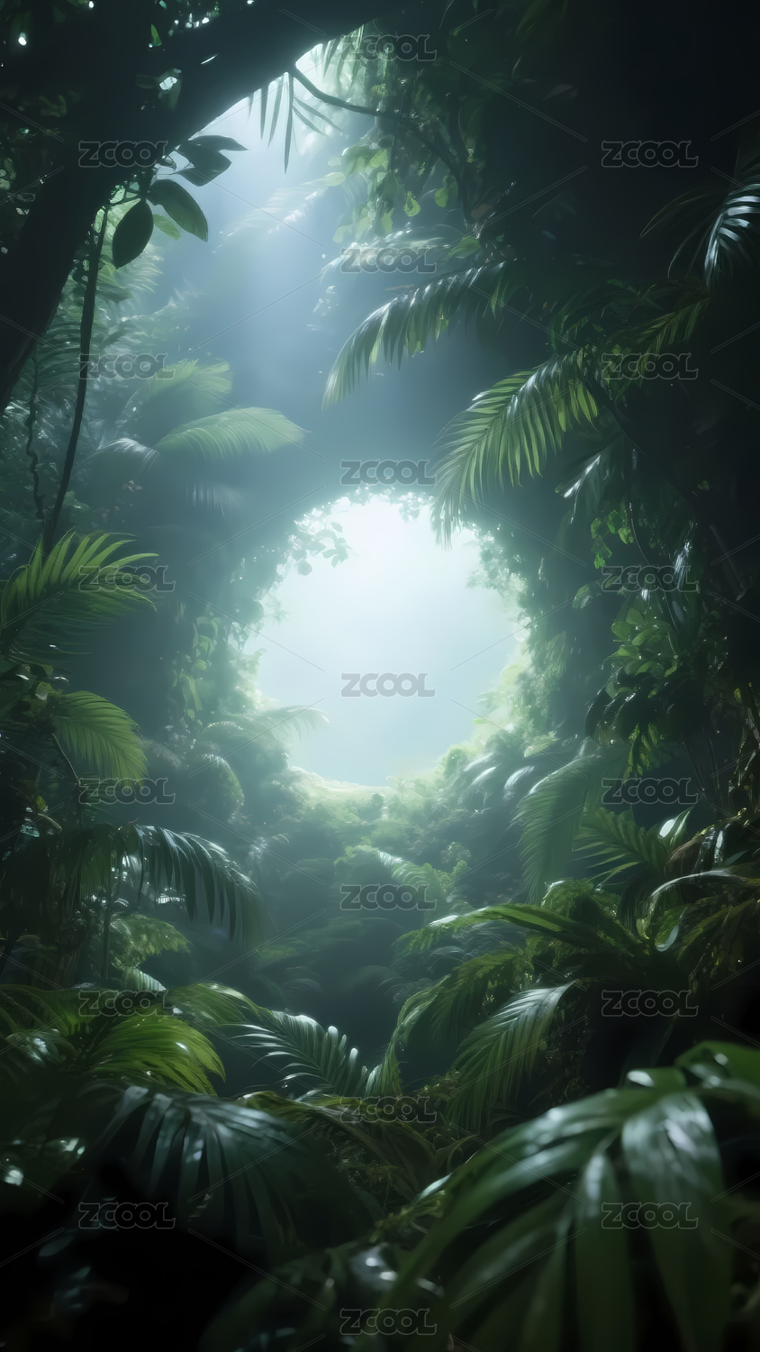 郁郁葱葱的热带雨林阳光穿过树叶照射进来