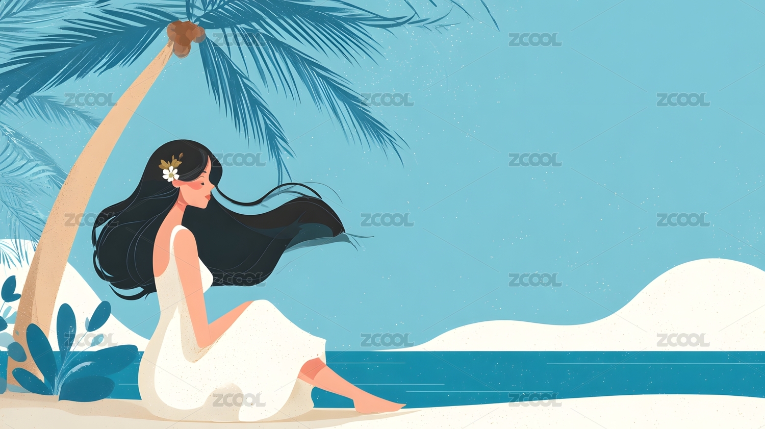 蔚蓝天空海边沙滩椰子树美女风景设计矢量图