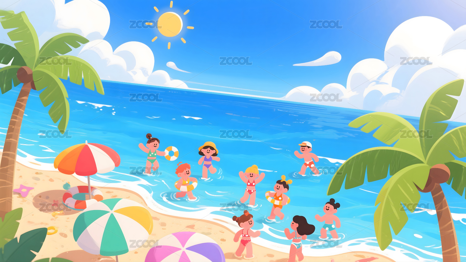 儿童节暑假放假休闲度假海边旅游游乐园插画
