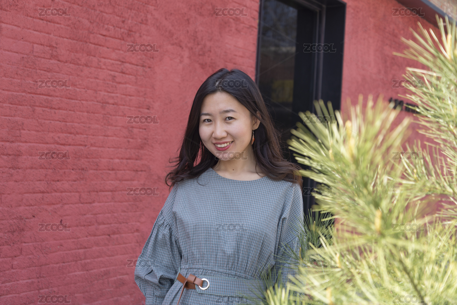 春天在北京798艺术区穿连衣裙的年轻女孩