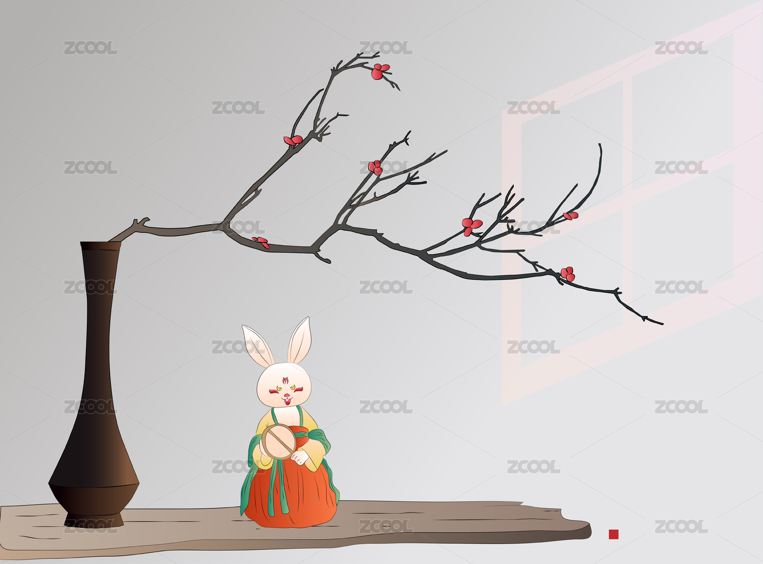 国潮古风盆景腊梅折枝宫装汉服兔娘矢量插画