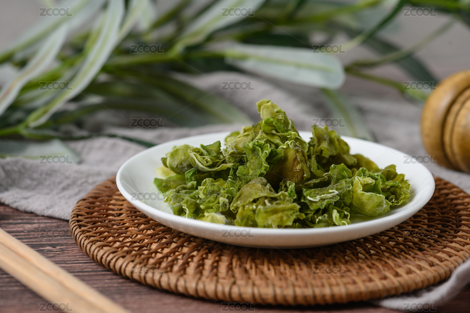 桌面上的盘子里的干爽的莴笋干