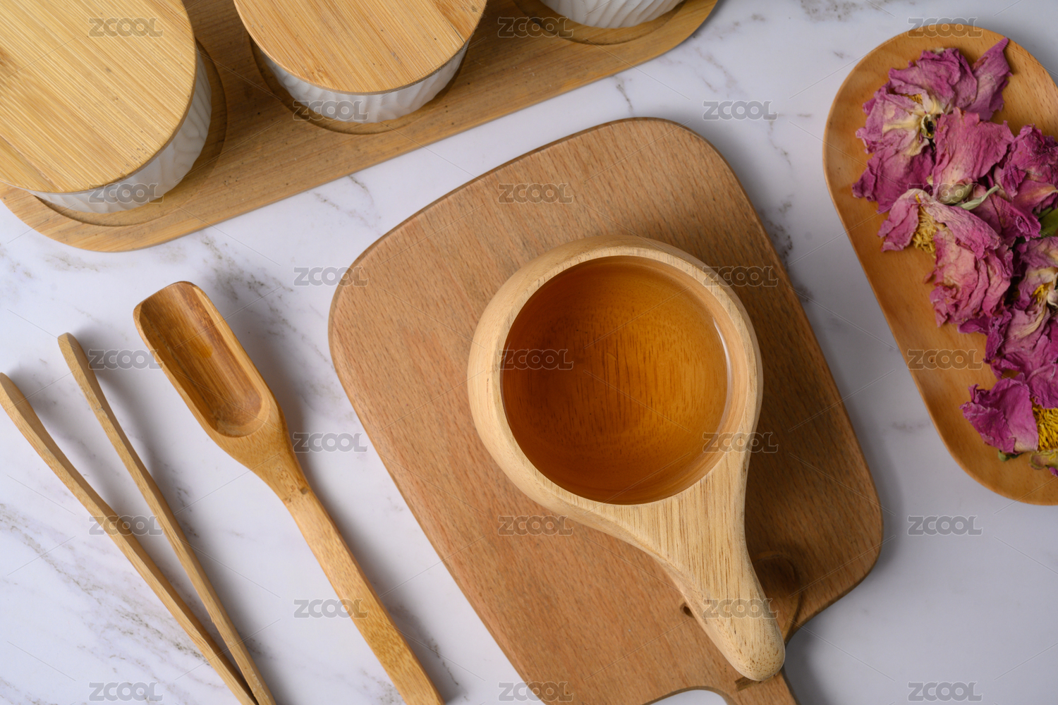 桌面上的杯子里的香甜可口的牡丹花苞茶