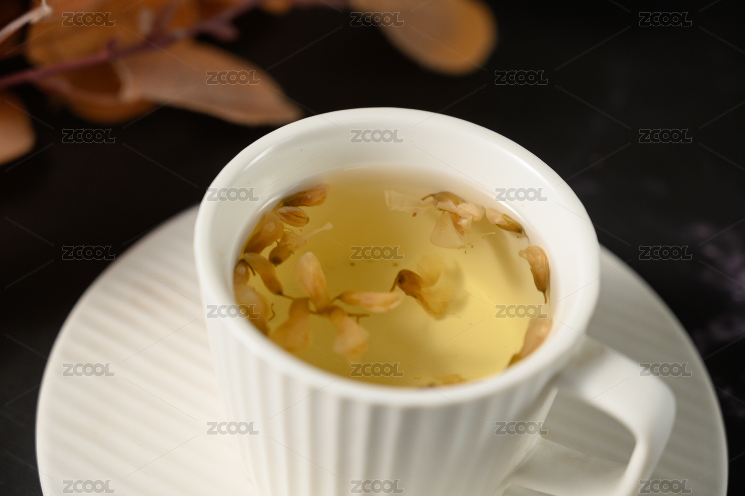 桌面上的杯子里的甘甜可口的茉莉吐珠茶