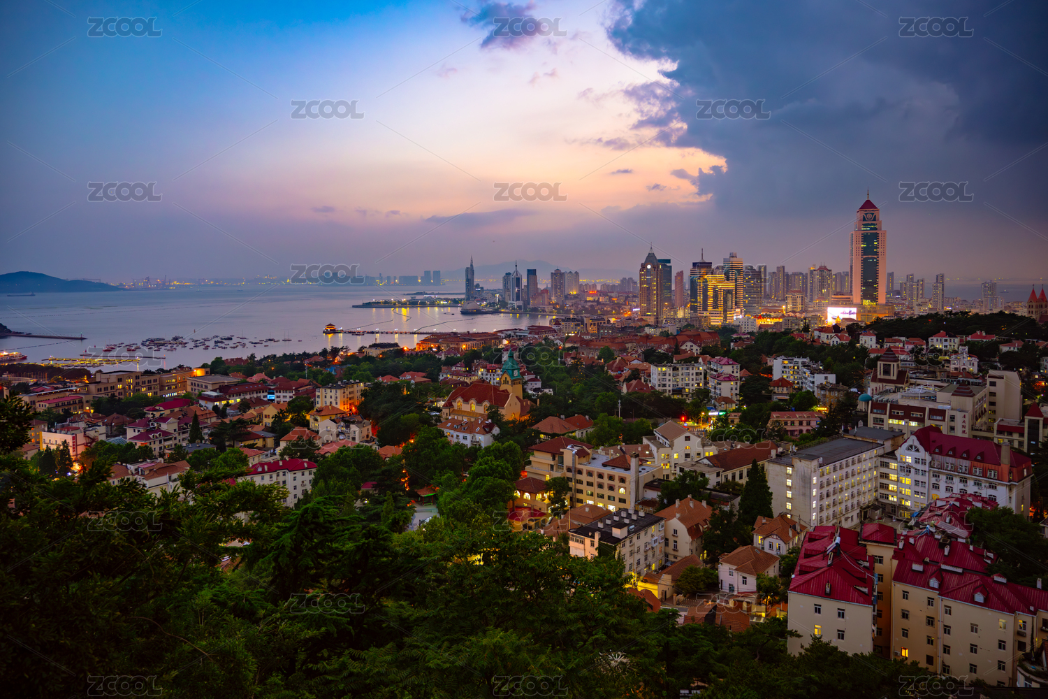 高视角俯瞰中国山东省青岛城市风光暮景