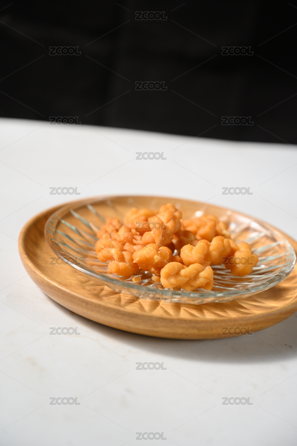 桌面上的盘子里的美味可口的油炸鱿鱼丝
