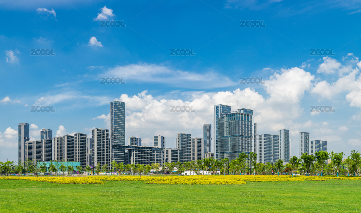 中国浙江上虞曹娥江滨大草坪与高层建筑
