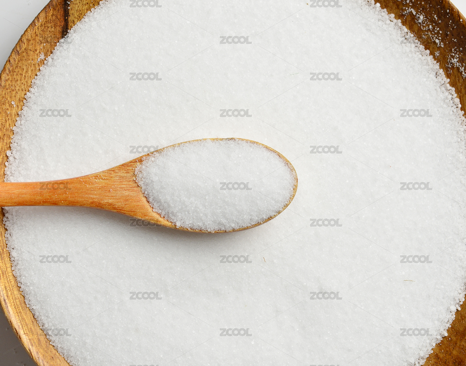 浅蓝色背景上的砂糖,和装了白砂糖的木勺