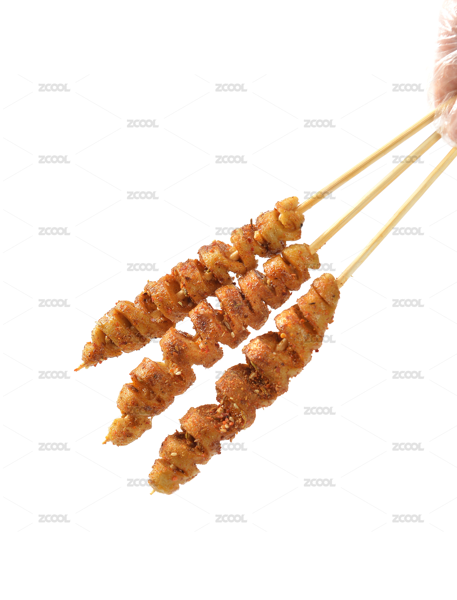 竹签串着炭火烤制烧烤麻辣烤串把把烧玉米粒